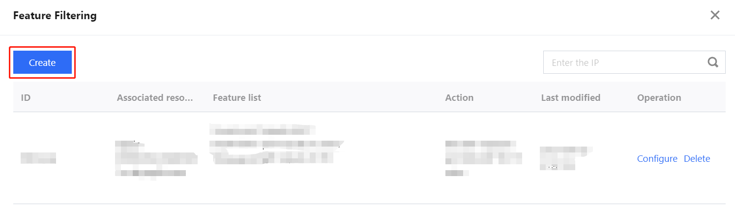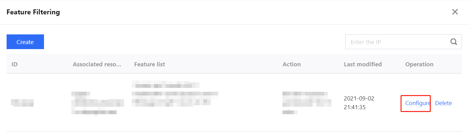 6. After the rule is created, it is added to the feature filtering list. To modify the rule, click Configure in the Operation column on the right.
