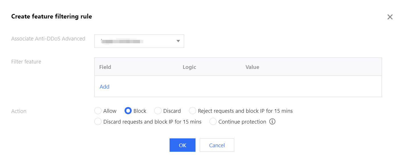 Anti-DDoS supports configuring custom blocking policies against specific IP, TCP, UDP message headers or loads. After enabling feature filtering, you can combine the matching conditions of the source port, destination port, message length, IP message header or load, and set the protection action to allow/block/discard matched requests, reject requests and block the IP for 15 minutes, discard requests and block the IP for 15 minutes, continue protection, and so on. With feature filtering, you can configure precise protection policies against business message features or attack message features.