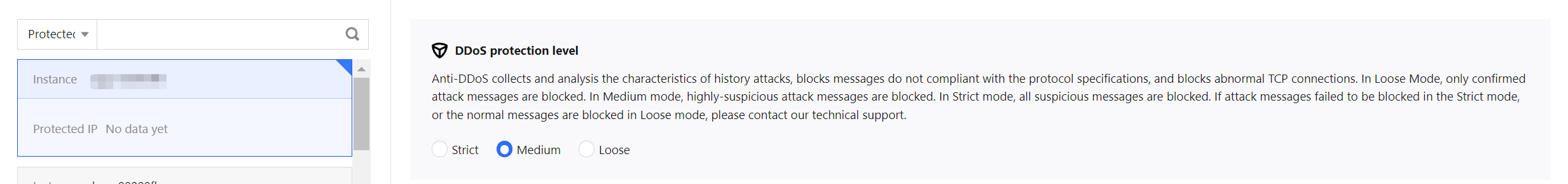 1. Log in to the new Anti-DDoS console and click DDoS Protection on the left sidebar. 2. Select an Anti-DDoS instance ID in the list on the left, such as "bgp-00xxxxxx".
