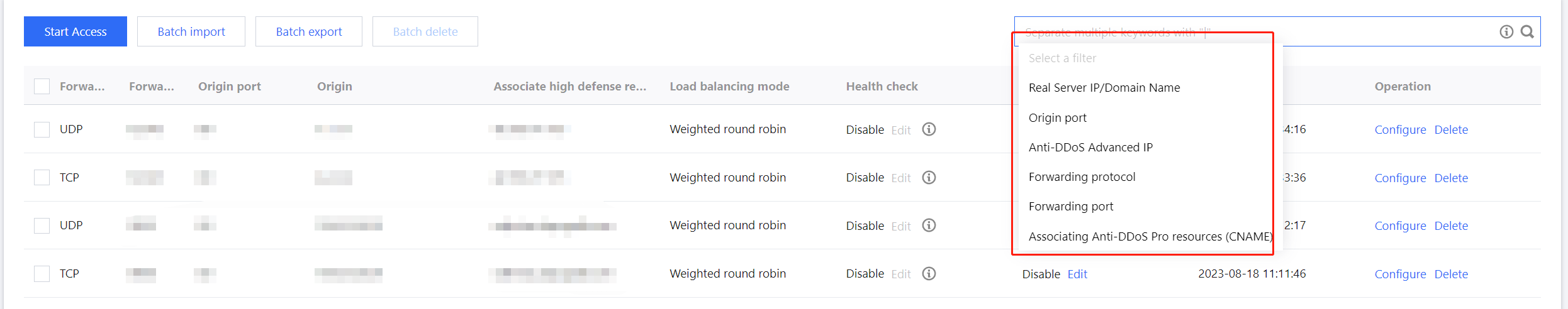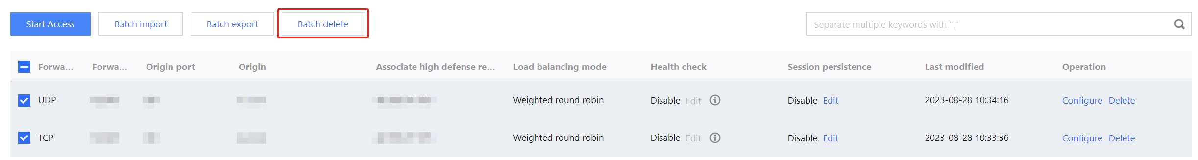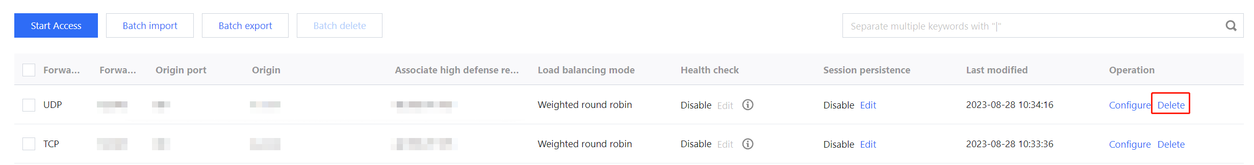 On the Access via port page, enter a real server IP/domain name, real server port, forwarding protocol, forwarding port, or an associated instance or associated CNAME resource in the search box. Deleting a rule