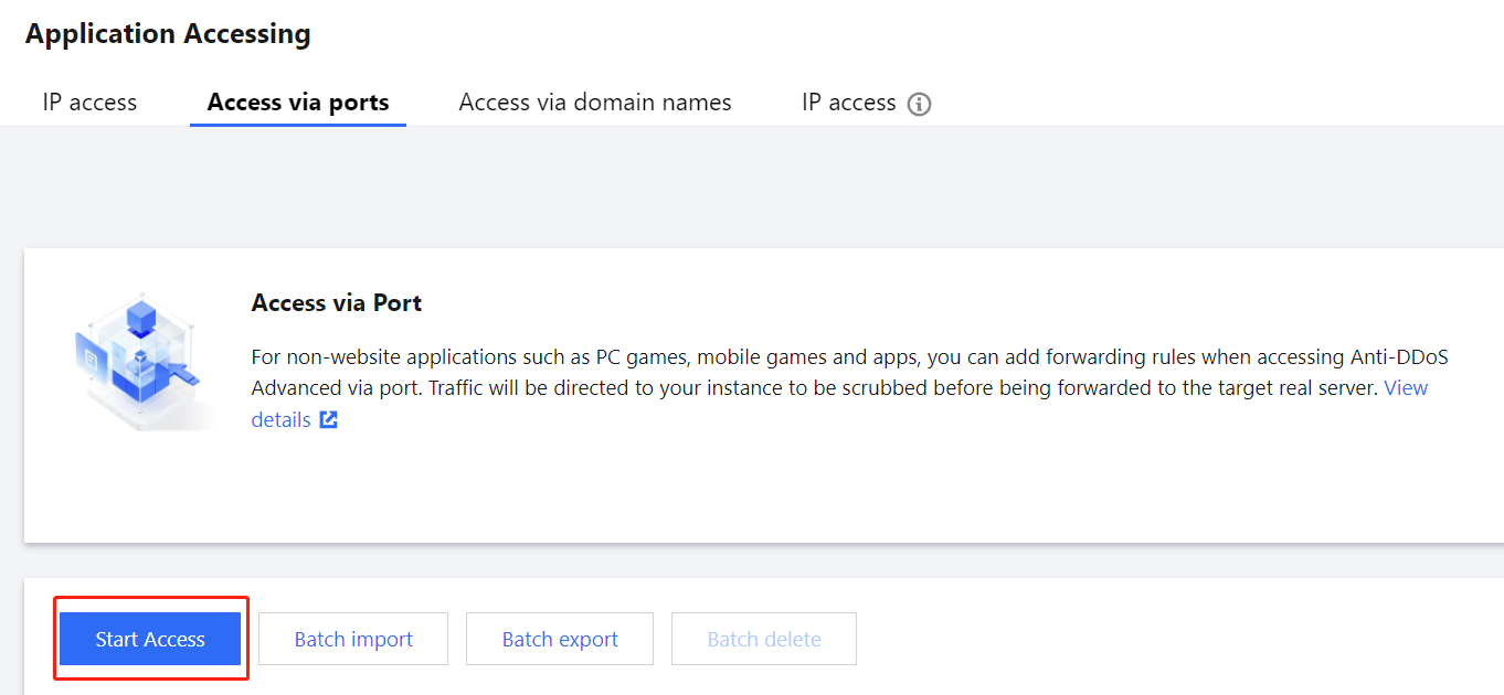 1. Log in to the new Anti-DDoS console, click Business Access on the left sidebar, and then click the Access via port tab. 2. On the Access via port page, click Start Access.