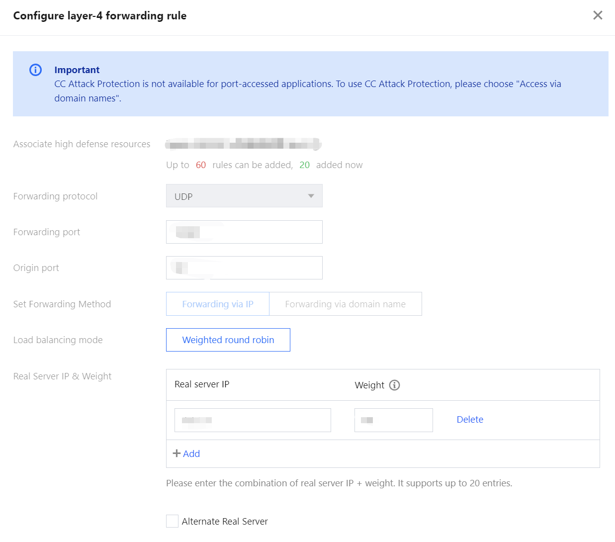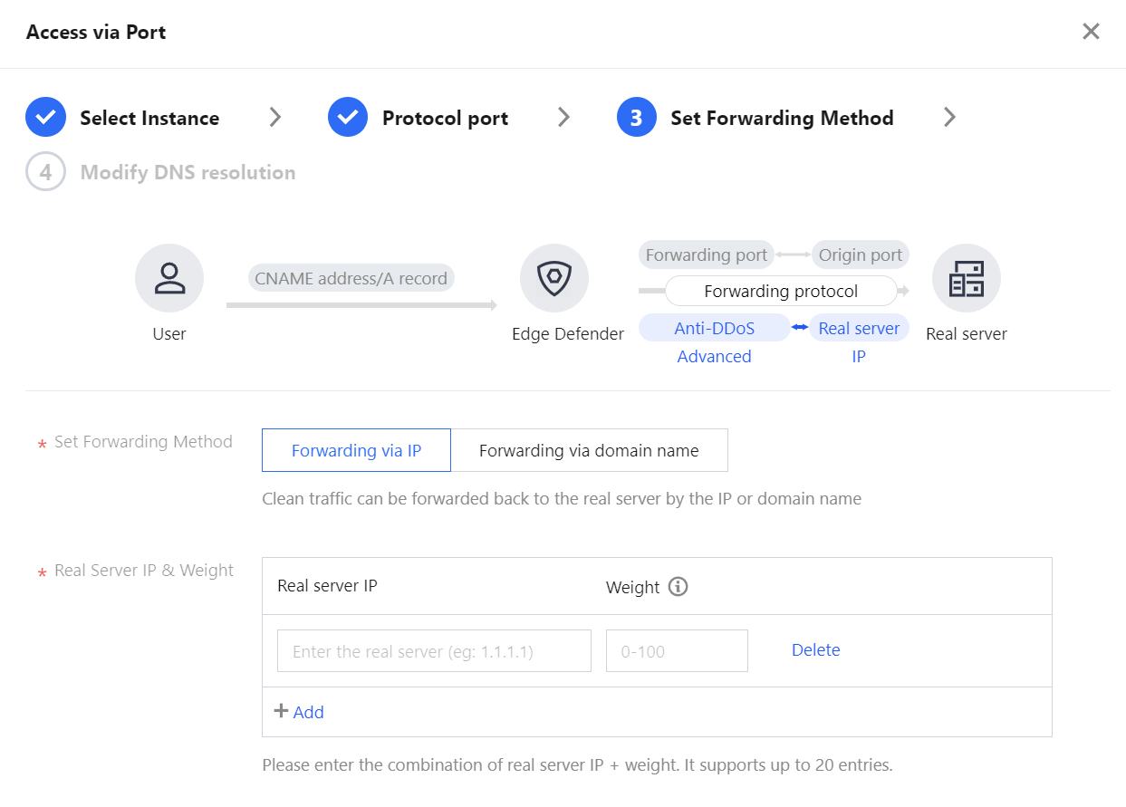 5. Select a forwarding method, specify a real server IP & port or real server domain name, and add an alternate real server and set the weight if you have one. Then click Next: Modify DNS Resolution.