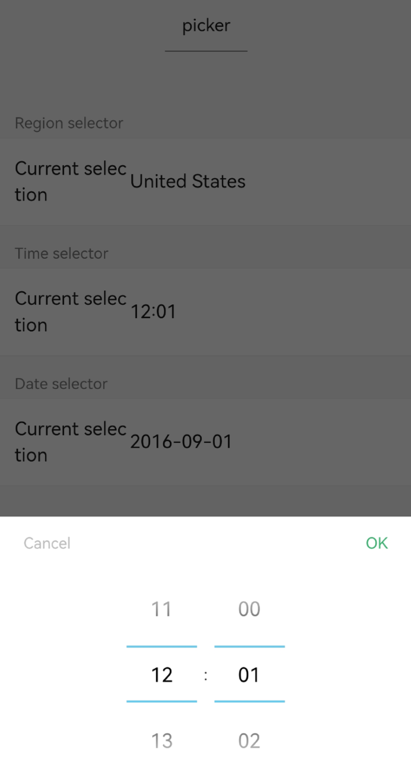 mode | string | selector: Normal picker multiSelector: Multi-column picker time: Time picker date: Date picker region: Region picker | selector | false | Type of the picker. |
