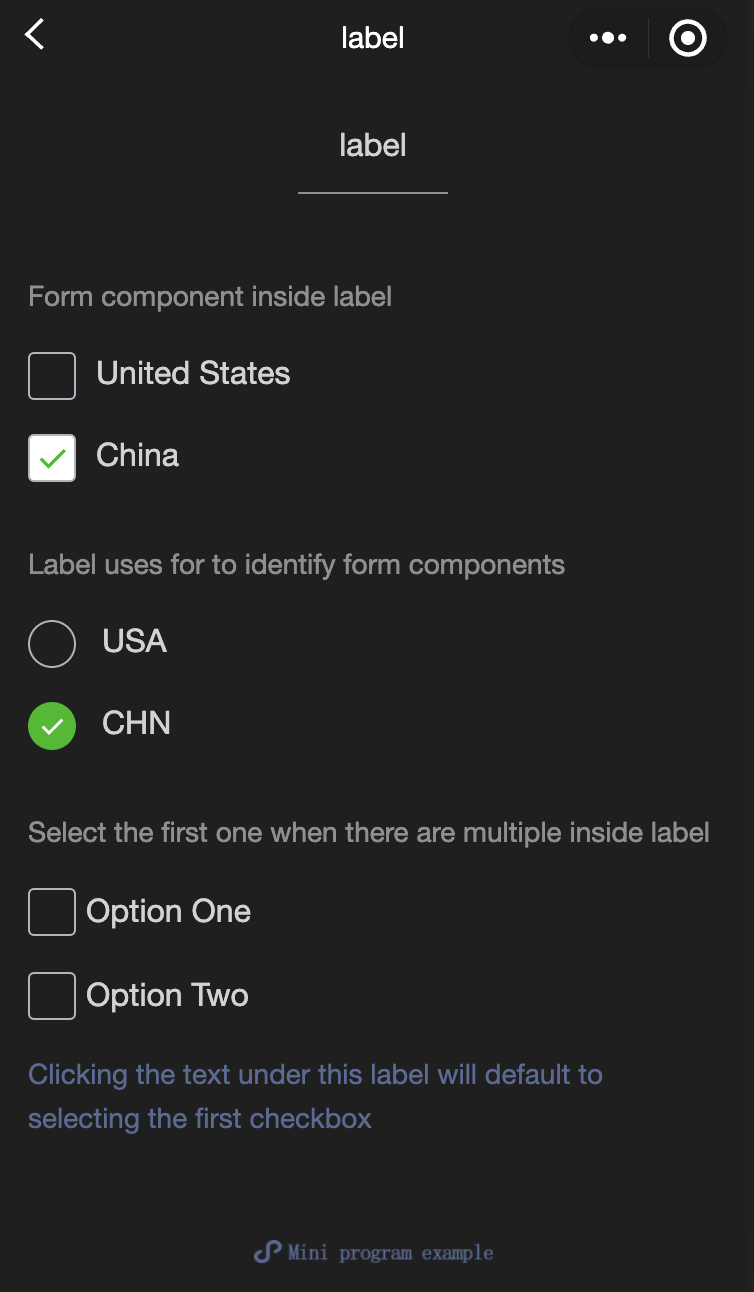 <view class="container"><view class="page-body"><view class="page-section page-section-gap"><view class="page-section-title">Form component inside label</view><checkbox-group class="group" bindchange="checkboxChange"><view class="label-1" wx:for="{{checkboxItems}}"><label><checkbox value="{{item.name}}" checked="{{item.checked}}"></checkbox><text class="label-1-text">{{item.value}}</text></label></view></checkbox-group></view><view class="page-section page-section-gap"><view class="page-section-title">Label uses for to identify form components</view><radio-group class="group" bindchange="radioChange"><view class="label-2" wx:for="{{radioItems}}"><radio id="{{item.name}}" value="{{item.name}}" checked="{{item.checked}}"></radio><label class="label-2-text" for="{{item.name}}"><text>{{item.name}}</text></label></view></radio-group></view><view class="page-section page-section-gap"><view class="page-section-title">Select the first one when there are multiple inside labels</view><label class="label-3"><checkbox class="checkbox-3">Option One</checkbox><checkbox class="checkbox-3">Option Two</checkbox><view class="label-3-text">Checking the text under this label will default to selecting the first checkbox</view></label></view></view></view>