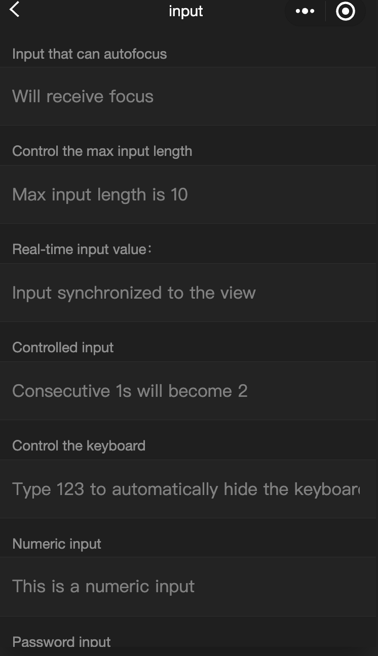 <view class="page-body"><view class="page-section"><view class="weui-cells__title">Inputs that can autofocus</view><view class="weui-cells weui-cells_after-title"><view class="weui-cell weui-cell_input"><input class="weui-input" auto-focus placeholder="Will receive focus"/></view></view></view><view class="page-section"><view class="weui-cells__title">Control the max input length</view><view class="weui-cells weui-cells_after-title"><view class="weui-cell weui-cell_input"><input class="weui-input" maxlength="10" placeholder="Max input length is 10" /></view></view></view><view class="page-section"><view class="weui-cells__title">Real-time input value: {{inputValue}}</view><view class="weui-cells weui-cells_after-title"><view class="weui-cell weui-cell_input"><input class="weui-input" maxlength="10" bindinput="bindKeyInput" placeholder="Input synchronized to the view"/></view></view></view><view class="page-section"><view class="weui-cells__title">Controlled input</view><view class="weui-cells weui-cells_after-title"><view class="weui-cell weui-cell_input"><input class="weui-input" bindinput="bindReplaceInput" placeholder="Consecutive 1s will become 2" /></view></view></view><view class="page-section"><view class="weui-cells__title">Control the keyboard</view><view class="weui-cells weui-cells_after-title"><view class="weui-cell weui-cell_input"><input class="weui-input" bindinput="bindHideKeyboard" placeholder="Type 123 to automatically hide the keyboard" /></view></view></view><view class="page-section"><view class="weui-cells__title">Numeric input</view><view class="weui-cells weui-cells_after-title"><view class="weui-cell weui-cell_input"><input class="weui-input" type="number" placeholder="This is a numeric input" /></view></view></view><view class="page-section"><view class="weui-cells__title">Passport input</view><view class="weui-cells weui-cells_after-title"><view class="weui-cell weui-cell_input"><input class="weui-input" password type="text" placeholder="This is an password input box" /></view></view></view><view class="page-section"><view class="weui-cells__title">Input with a decimal point</view><view class="weui-cells weui-cells_after-title"><view class="weui-cell weui-cell_input"><input class="weui-input" type="digit" placeholder="Numeric keyboard with a decimal point"/></view></view></view><view class="page-section"><view class="weui-cells__title">ID card input</view><view class="weui-cells weui-cells_after-title"><view class="weui-cell weui-cell_input"><input class="weui-input" type="idcard" placeholder="ID card keyboard" /></view></view></view><view class="page-section"><view class="weui-cells__title">Control placeholder color</view><view class="weui-cells weui-cells_after-title"><view class="weui-cell weui-cell_input"><input class="weui-input" placeholder-style="color:#F76260" placeholder="Placeholder font is red" /></view></view></view></view>