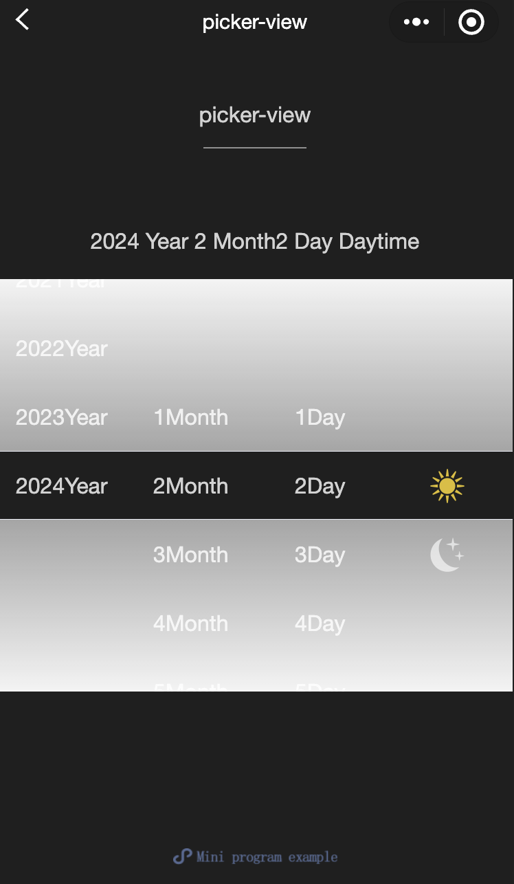 const date = new Date()const years = []const months = []const days = []for (let i = 1990; i <= date.getFullYear(); i++) {years.push(i)}for (let i = 1; i <= 12; i++) {months.push(i)}for (let i = 1; i <= 31; i++) {days.push(i)}Page({onShareAppMessage() {return {title: 'picker-view',path: 'page/component/pages/picker-view/picker-view'}},data: {years,year: date.getFullYear(),months,month: 2,days,day: 2,value: [9999, 1, 1],isDaytime: true,},bindChange(e) {const val = e.detail.valuethis.setData({year: this.data.years[val[0]],month: this.data.months[val[1]],day: this.data.days[val[2]],isDaytime: !val[3]})}})
