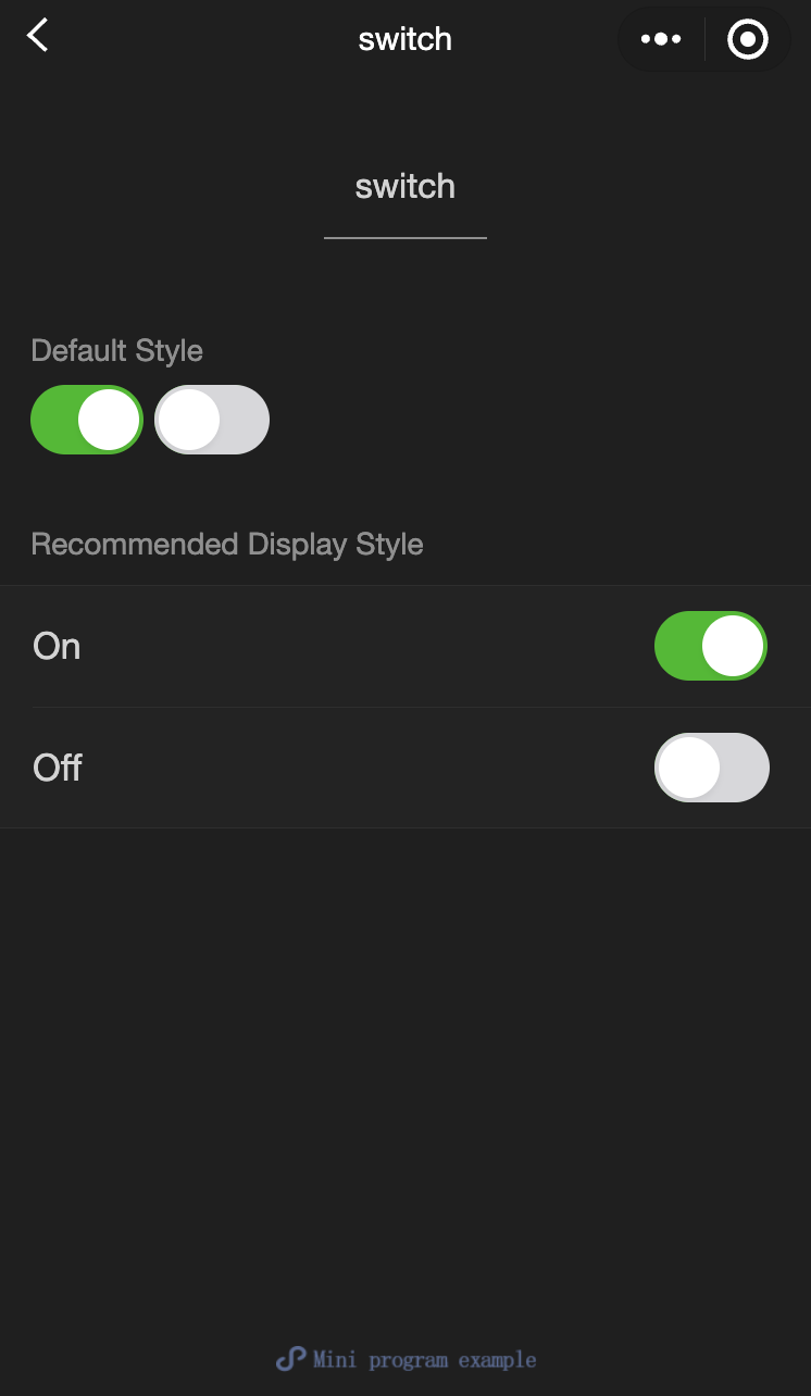 <view class="page"><view class="page__hd"><text class="page__title">switch</text><text class="page__desc">switch</text></view><view class="page__bd"><view class="section section_gap"><view class="section__title">type="switch"</view><view class="body-view"><switch checked="{{switch1Checked}}" bindchange="switch1Change"/></view></view><view class="section section_gap"><view class="section__title">type="checkbox"</view><view class="body-view"><switch type="checkbox" checked="{{switch2Checked}}" bindchange="switch2Change"/></view></view></view></view>