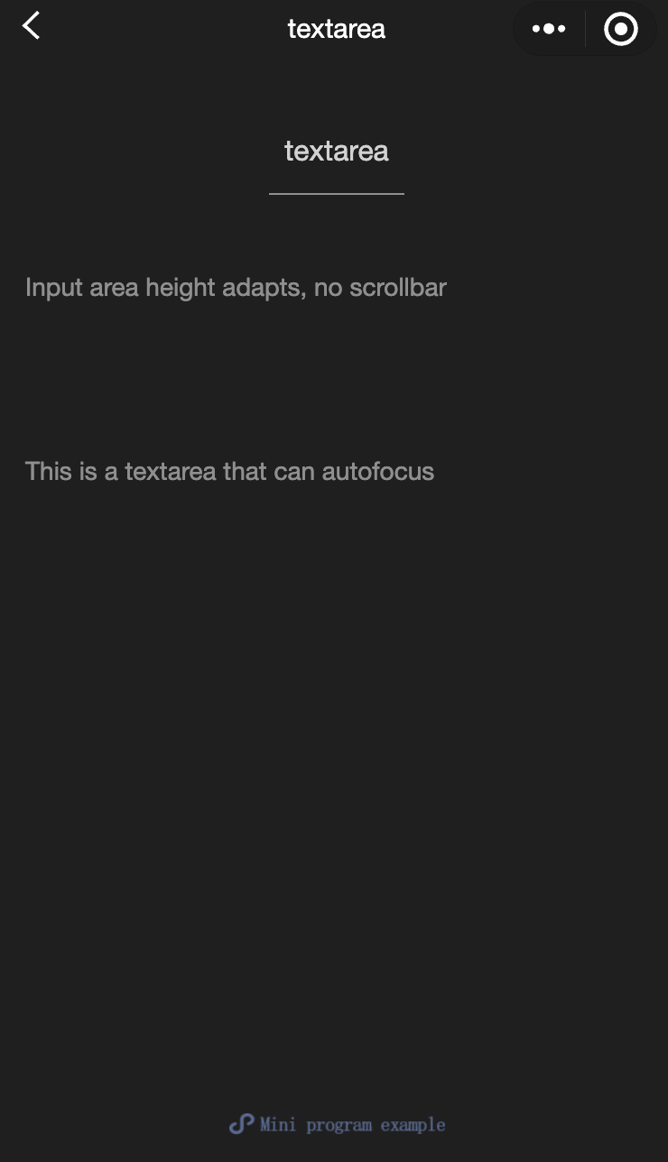 <view class="section"><textarea bindblur="bindTextAreaBlur" auto-height placeholder="Automatic height adjustment" /></view><view class="section"><textarea placeholder="The placeholder color is red" placeholder-style="color:red;" /></view><view class="section"><textarea placeholder="This is a textarea that can autofocus" auto-focus /></view><view class="section"><textarea placeholder="This will only be focused when the button is tapped" focus="{{focus}}" /><view class="btn-area"><button bindtap="bindButtonTap">Make the input box focused</button></view></view><view class="section"><form bindsubmit="bindFormSubmit"><textarea placeholder="Textarea in the form component"/><button form-type="submit"> Submit </button></form></view>