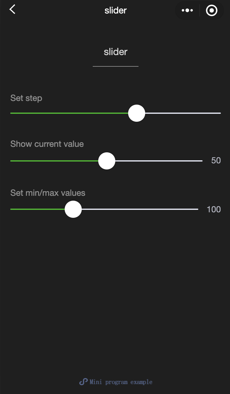 <view class="page"><view class="page__hd"><text class="page__title">slider</text><text class="page__desc">slider</text></view><view class="page__bd"><view class="page-section page-section-gap"><view class="page-section-title">Set step</view><view class="body-view"><slider value="60" bindchange="slider2change" step="5"/></view></view><view class="page-section page-section-gap"><view class="page-section-title">Show current value</view><view class="body-view"><slider value="50" bindchange="slider3change" show-value/></view></view><view class="page-section page-section-gap"><view class="page-section-title">Set min/max values</view><view class="body-view"><slider value="100" bindchange="slider4change" min="50" max="200" show-value/></view></view></view></view>