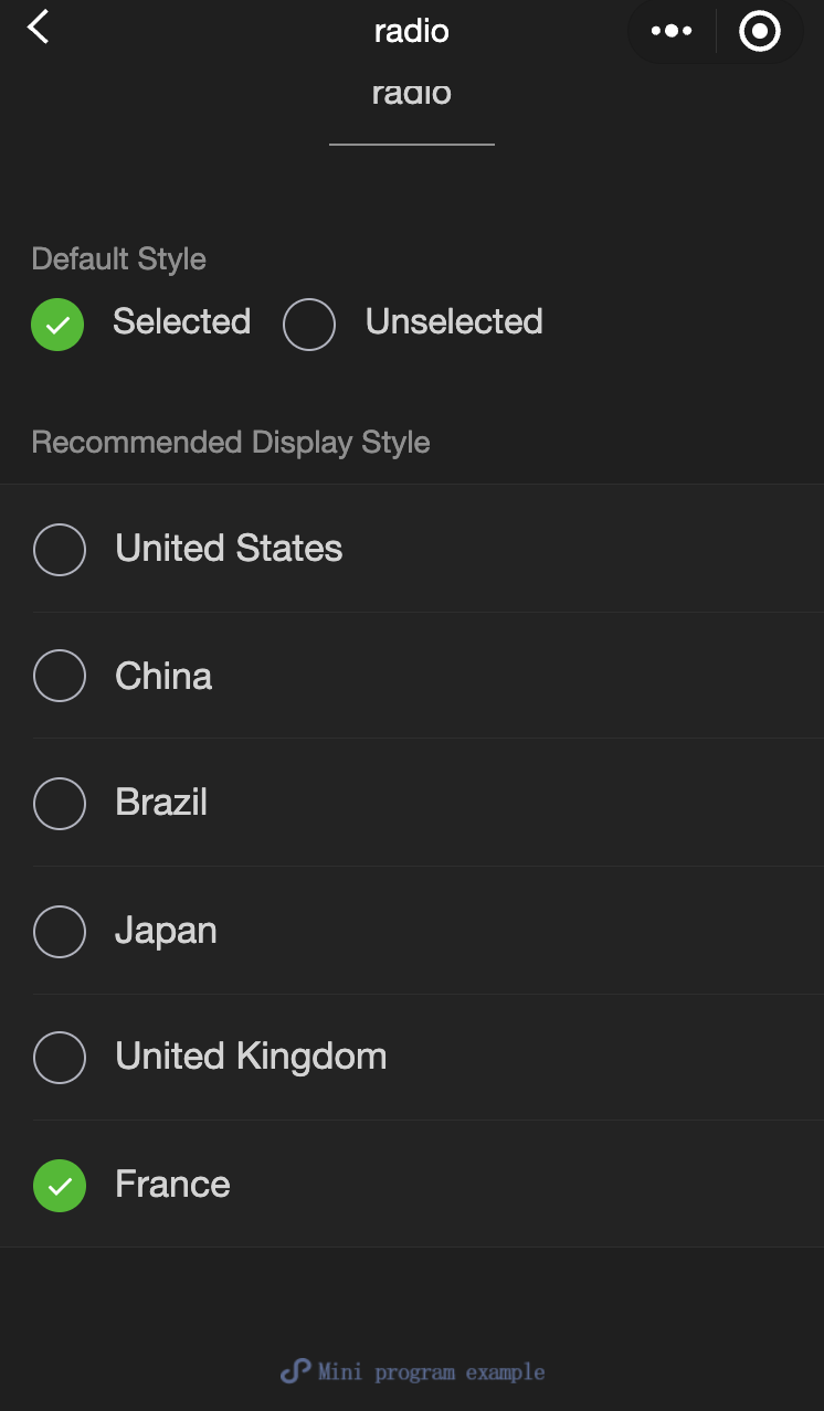 Page({onShareAppMessage() {return {title: 'radio',path: 'page/component/pages/radio/radio'}},data: {items: [{value: 'USA', name: 'United States'},{value: 'CHN', name: 'China', checked: 'true'},{value: 'BRA', name: 'Brazil'},{value: 'JPN', name: 'Japan'},{value: 'ENG', name: 'United Kingdom'},{value: 'FRA', name: 'France'},]},radioChange(e) {console.log('Radio change event occurred, carrying value: ', e.detail.value)const items = this.data.itemsfor (let i = 0, len = items.length; i < len; ++i) {items[i].checked = items[i].value === e.detail.value}this.setData({items})}})