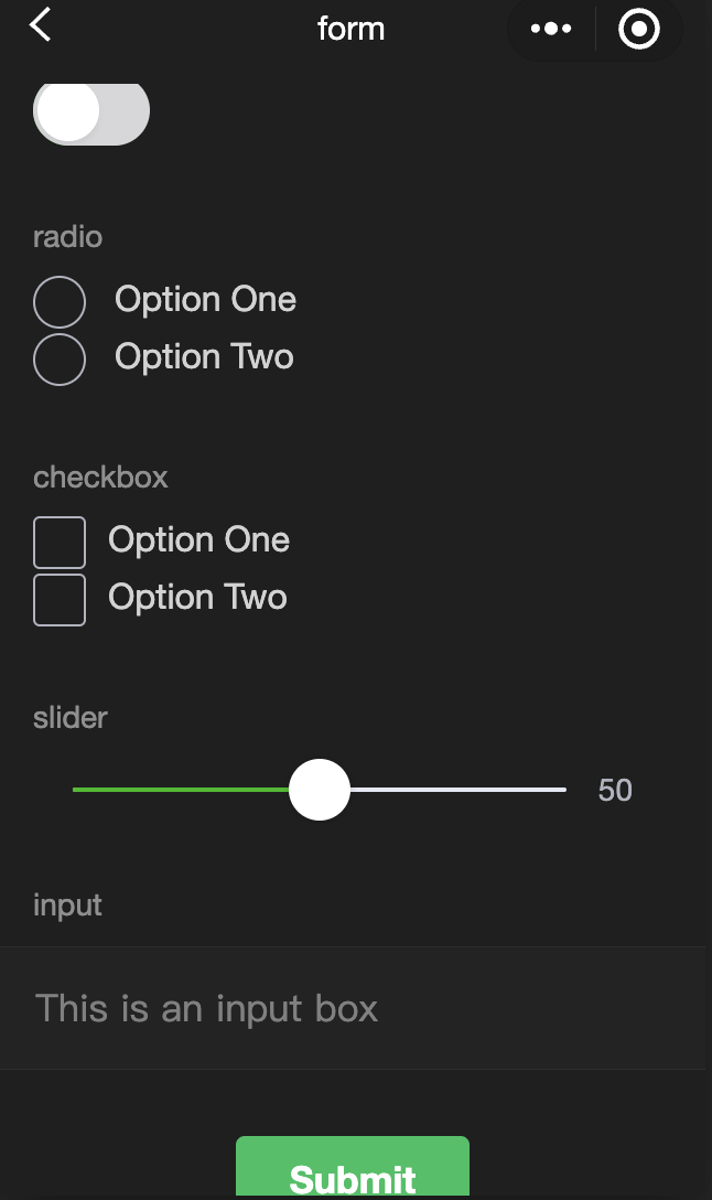 <view class="container"><view class="page-body"><form catchsubmit="formSubmit" catchreset="formReset"><view class="page-section page-section-gap"><view class="page-section-title">switch</view><switch name="switch"/></view><view class="page-section page-section-gap"><view class="page-section-title">radio</view><radio-group name="radio"><label><radio value="radio1"/>Option One</label><label><radio value="radio2"/>Option Two</label></radio-group></view><view class="page-section page-section-gap"><view class="page-section-title">checkbox</view><checkbox-group name="checkbox"><label><checkbox value="checkbox1"/>Option One</label><label><checkbox value="checkbox2"/>Option Two</label></checkbox-group></view><view class="page-section page-section-gap"><view class="page-section-title">slider</view><slider value="50" name="slider" show-value ></slider></view><view class="page-section"><view class="page-section-title">input</view><view class="weui-cells weui-cells_after-title"><view class="weui-cell weui-cell_input"><view class="weui-cell__bd" style="margin: 30rpx 0" ><input class="weui-input" name="input" placeholder="This is an input box" /></view></view></view></view><view class="btn-area"><button style="margin: 30rpx 0" type="primary" formType="submit">Submit</button><button style="margin: 30rpx 0" formType="reset">Reset</button></view></form></view></view>