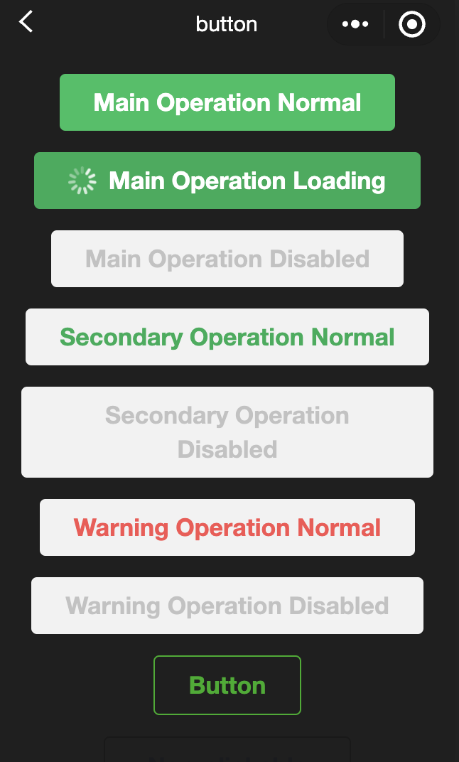 <view class="page-body"><view class="btn-area" id="buttonContainer"><button type="primary">Main Operation Normal</button><button type="primary" loading="true">Main Operation Loading</button><button type="primary" disabled="true">Main Operation Disabled</button><button type="default">Secondary Operation Normal</button><button type="default" disabled="true">Secondary Operation Disabled</button><button type="warn">Warning Operation Normal</button><button type="warn" disabled="true">Warning Operation Disabled</button><view class="button-sp-area"><button type="primary" plain="true">Button</button><button type="primary" disabled="true" plain="true">Disabled button</button><button type="default" plain="true">Button</button><button type="default" disabled="true" plain="true">Button</button><button class="mini-btn" type="primary" size="mini">Button</button><button class="mini-btn" type="default" size="mini">Button</button><button class="mini-btn" type="warn" size="mini">Button</button></view><button open-type="share">Share</button><button open-type="share" share-mode="{{shareMode}}">Share button</button></view></view>