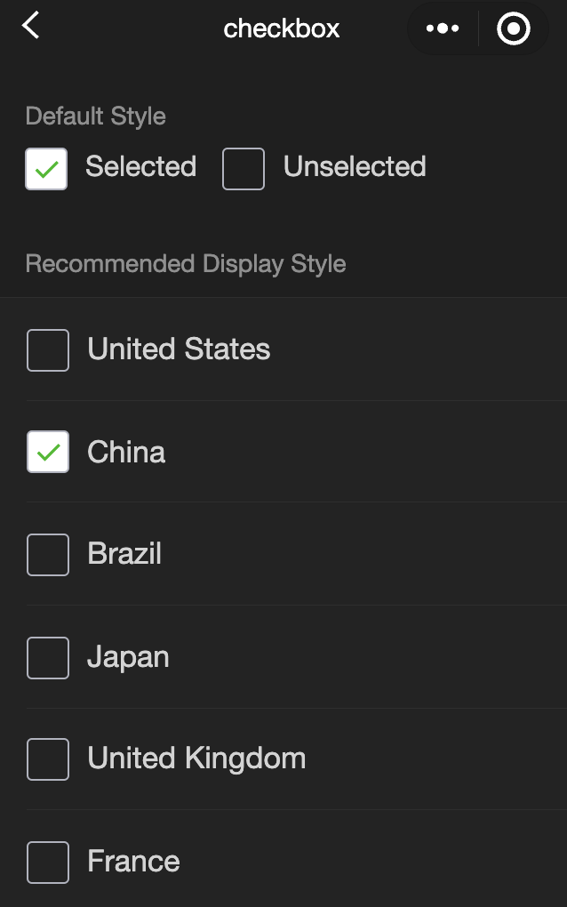 <view class="container"><view class="page-body"><view class="page-section page-section-gap"><view class="page-section-title">Default style</view><label class="checkbox"><checkbox value="cb" checked="true"/>Selected</label><label class="checkbox"><checkbox value="cb" />Unselected</label></view><view class="page-section"><view class="page-section-title">Recommended Display Style</view><view class="weui-cells weui-cells_after-title"><checkbox-group bindchange="checkboxChange"><label class="weui-cell weui-check__label" wx:for="{{items}}" wx:key="{{item.value}}"><view class="weui-cell__hd"><checkbox value="{{item.value}}" checked="{{item.checked}}"/></view><view class="weui-cell__bd">{{item.name}}</view></label></checkbox-group></view></view></view></view>