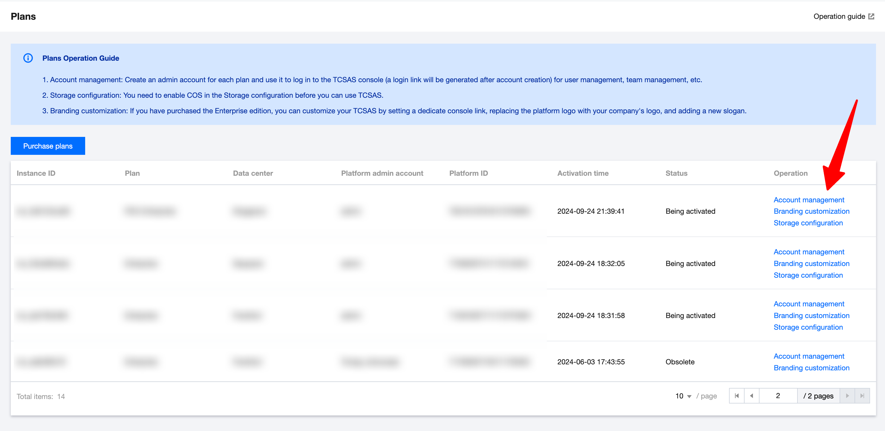 1. In the console, navigate to the Plans page and click Account management to create a super admin account for Super App as a Service.