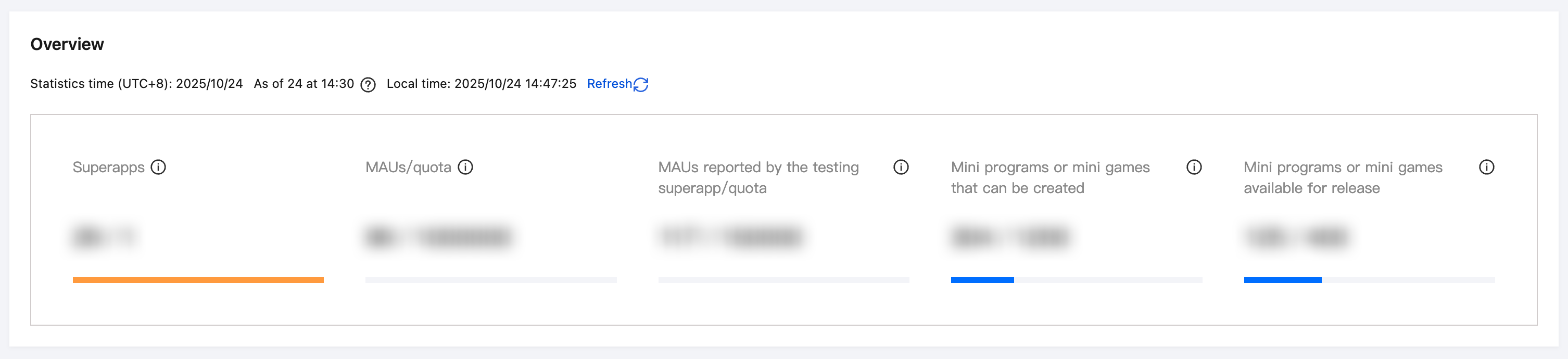 Billing description: Once the free quota is used up, additional MAUs will be charged. For detailed billing information, seeBilling Overview. MAUs reported by the testing superapp / quota: