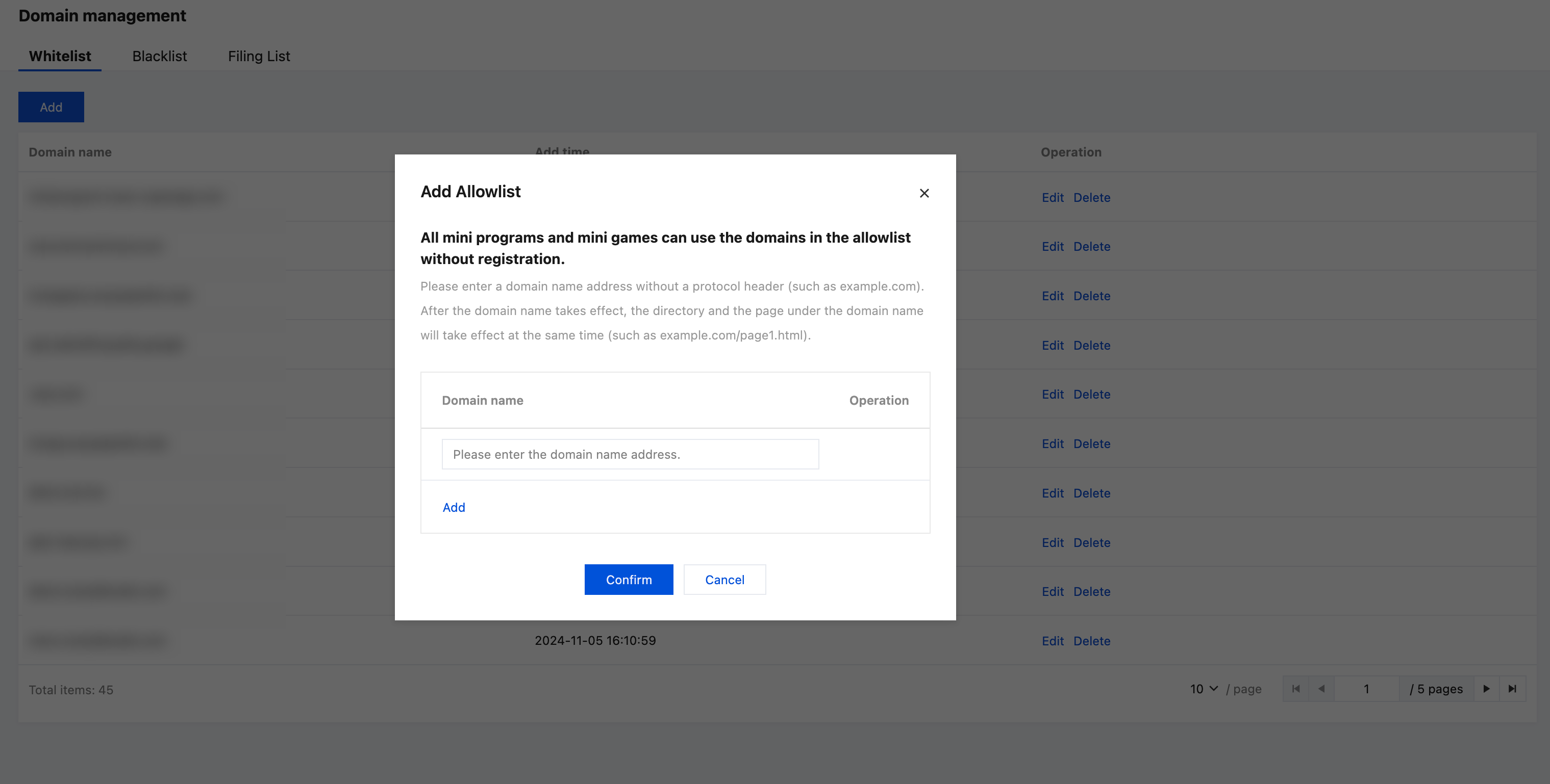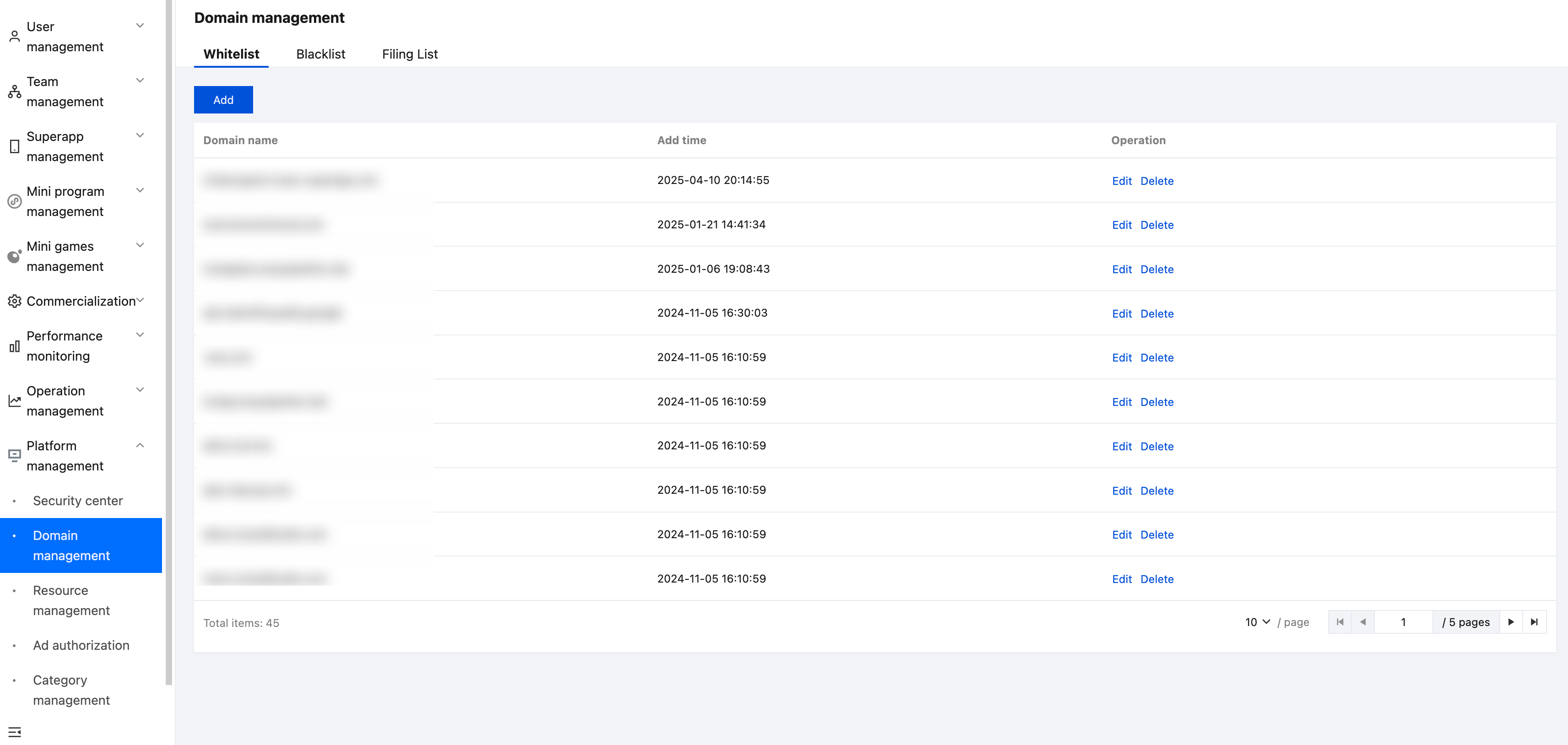 The super admin and the platform admin can add/remove mini program domains to/from the allowlist/blocklist, affecting all mini programs. The super admin and the platform admin can also add secondary domain names using wildcards. For example, https://www.tencent.com can be changed to tencent.com or .tencent.com.