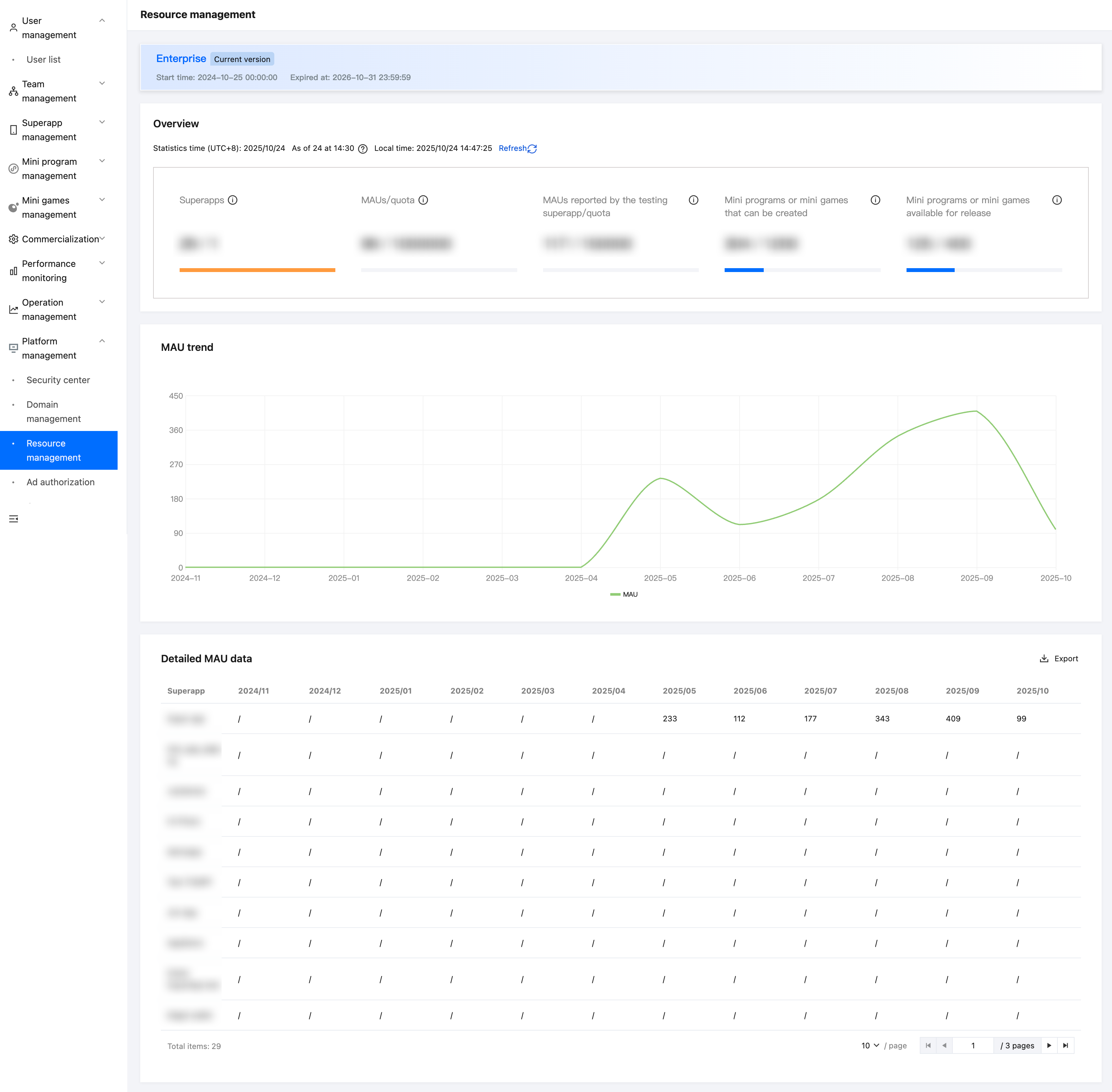 Restriction: After the reported MAU reaches the limit, new users will no longer be able to open mini programs or mini games within superapps using non-production package names.