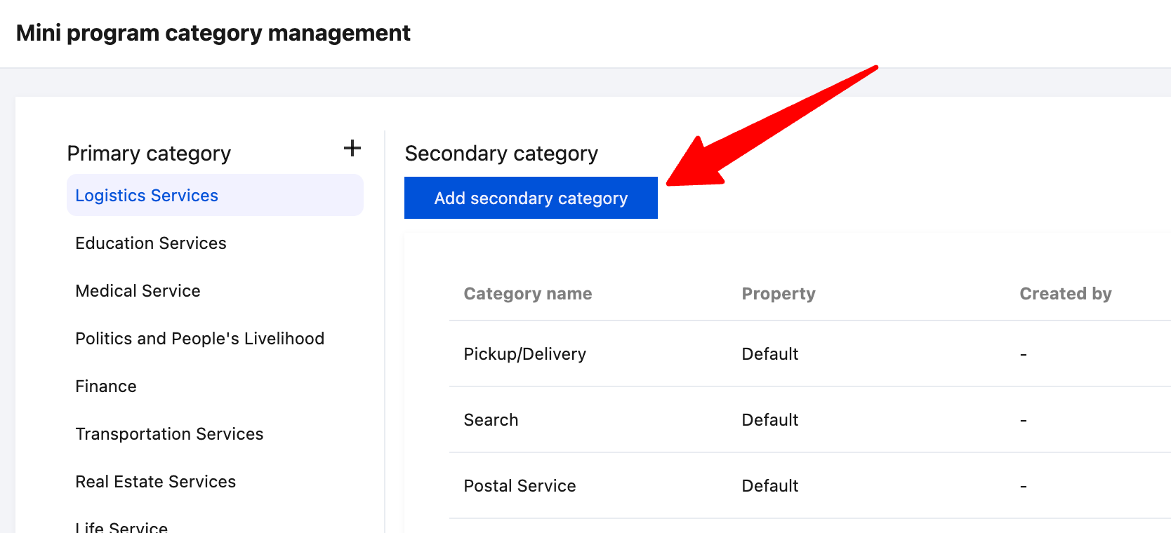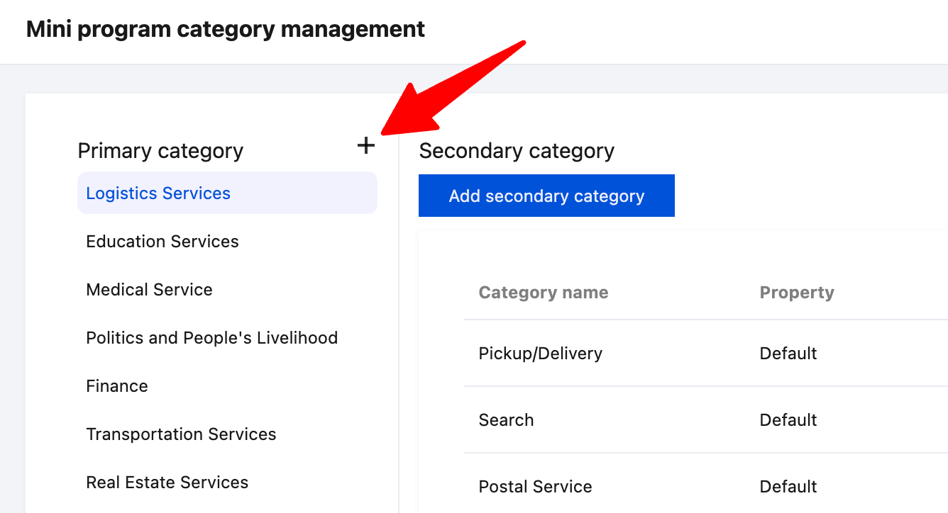 SAS provides a default list of mini program categories. When creating a mini program, you can assign a category to it. If the system's categories don't meet your needs, manually add primary and secondary categories for your mini programs.