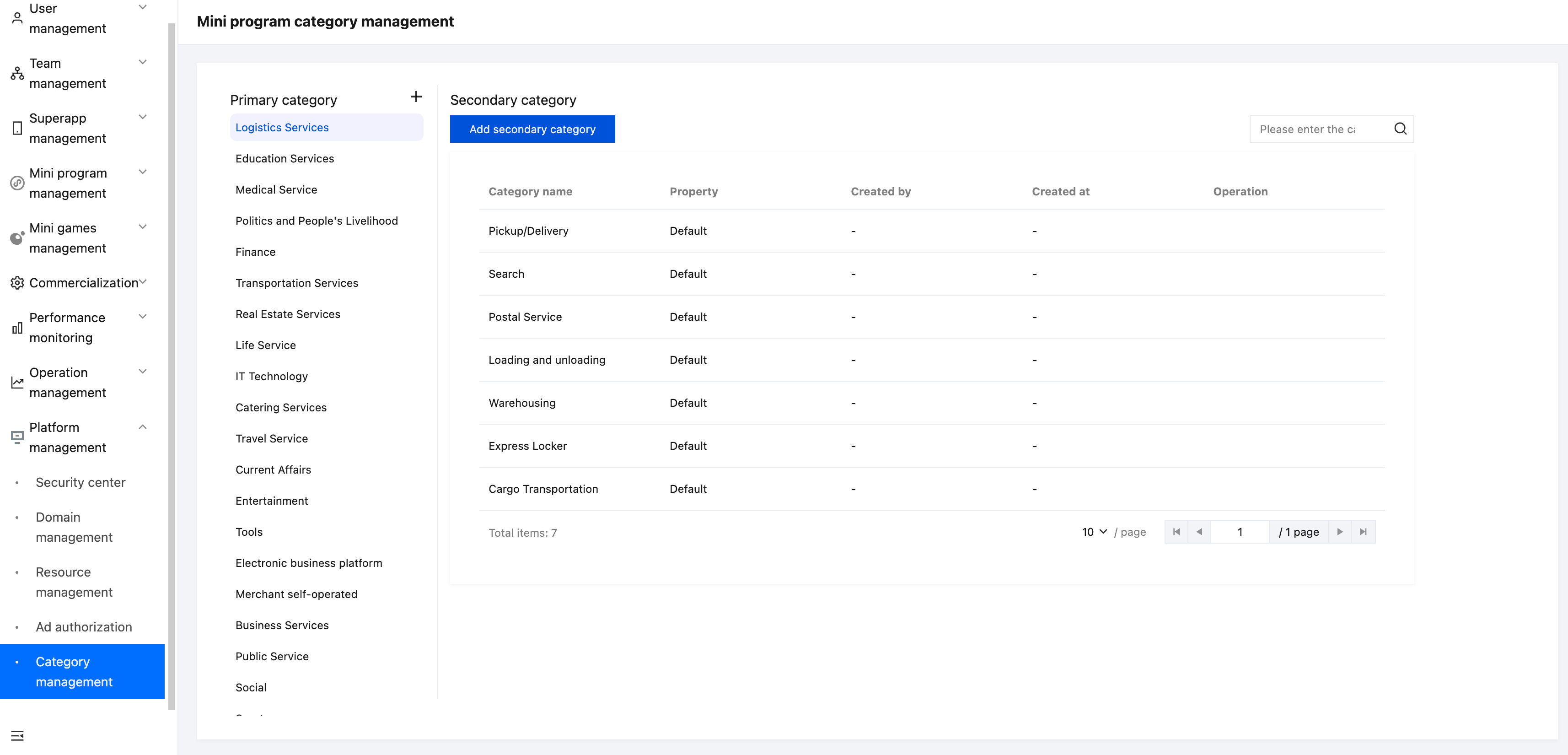 Under Platform management - Category management, you can view the system's default list of mini program categories. The super admin or platform admin can customize primary categories or add custom secondary categories under a primary category.