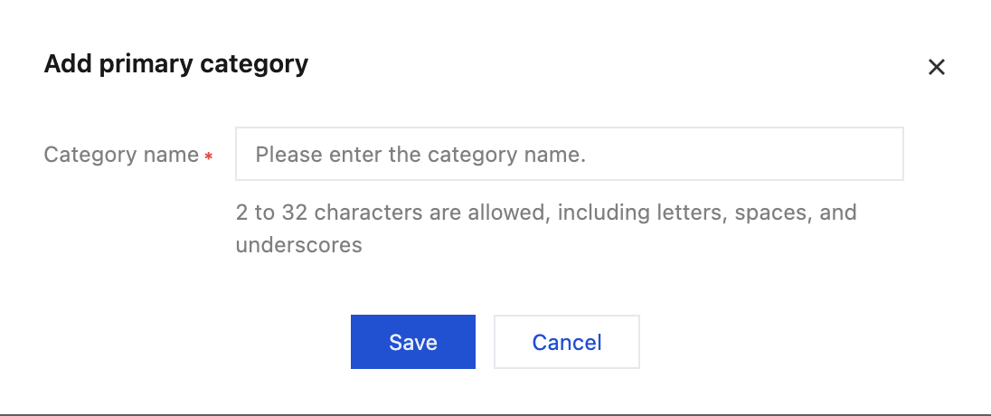 Enter the primary category name (2-32 characters allowed, including letters, spaces, and underscores), then click Save.