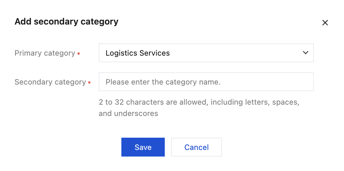 Enter the secondary category name (2-32 characters allowed, including letters, spaces, and underscores), then click Save.