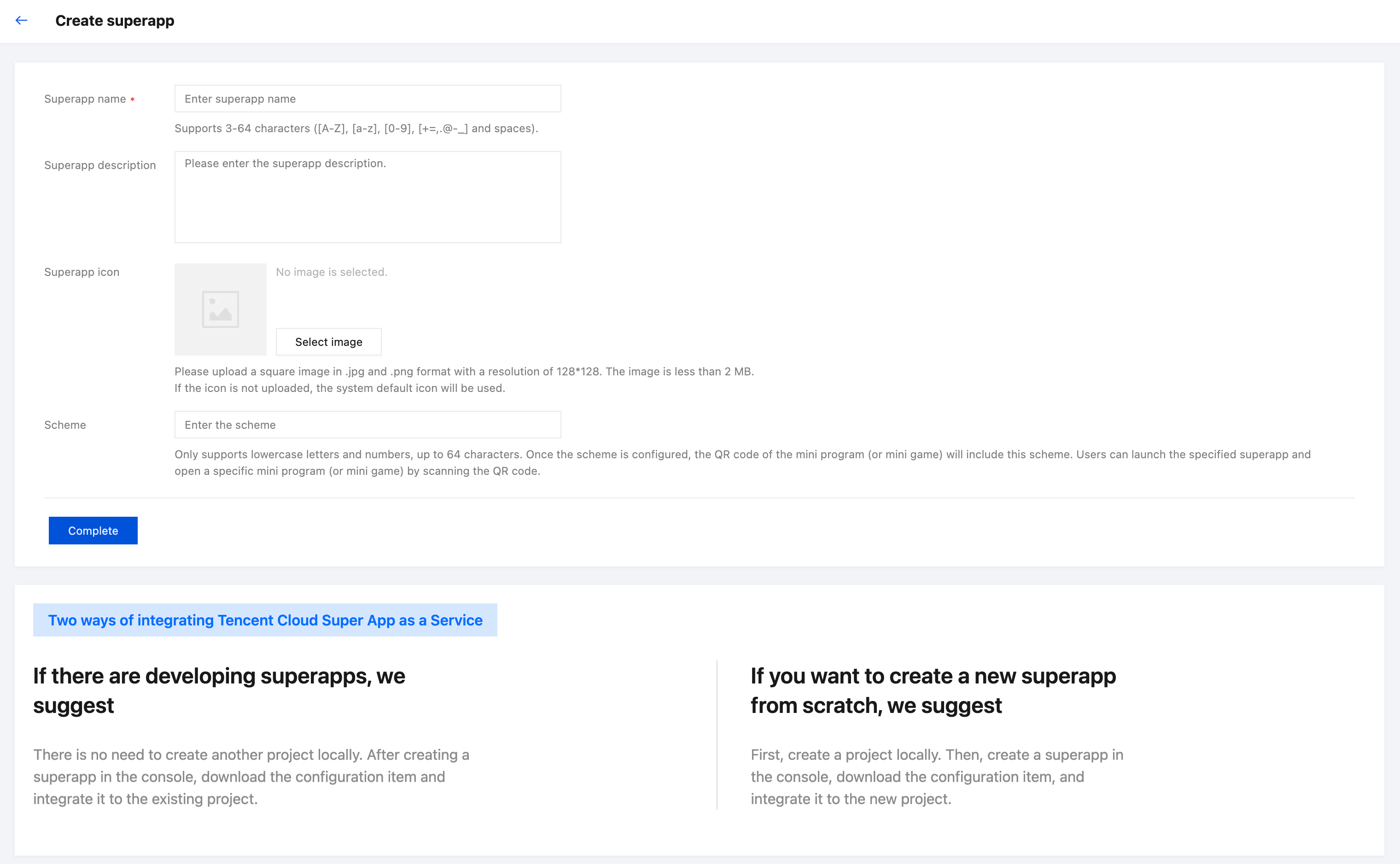 Superapp name: Supports 3-64 characters including a-z, A-Z, 0-9, spaces and some special symbols ("+", "=", ",", ".", "@", "-", "_").