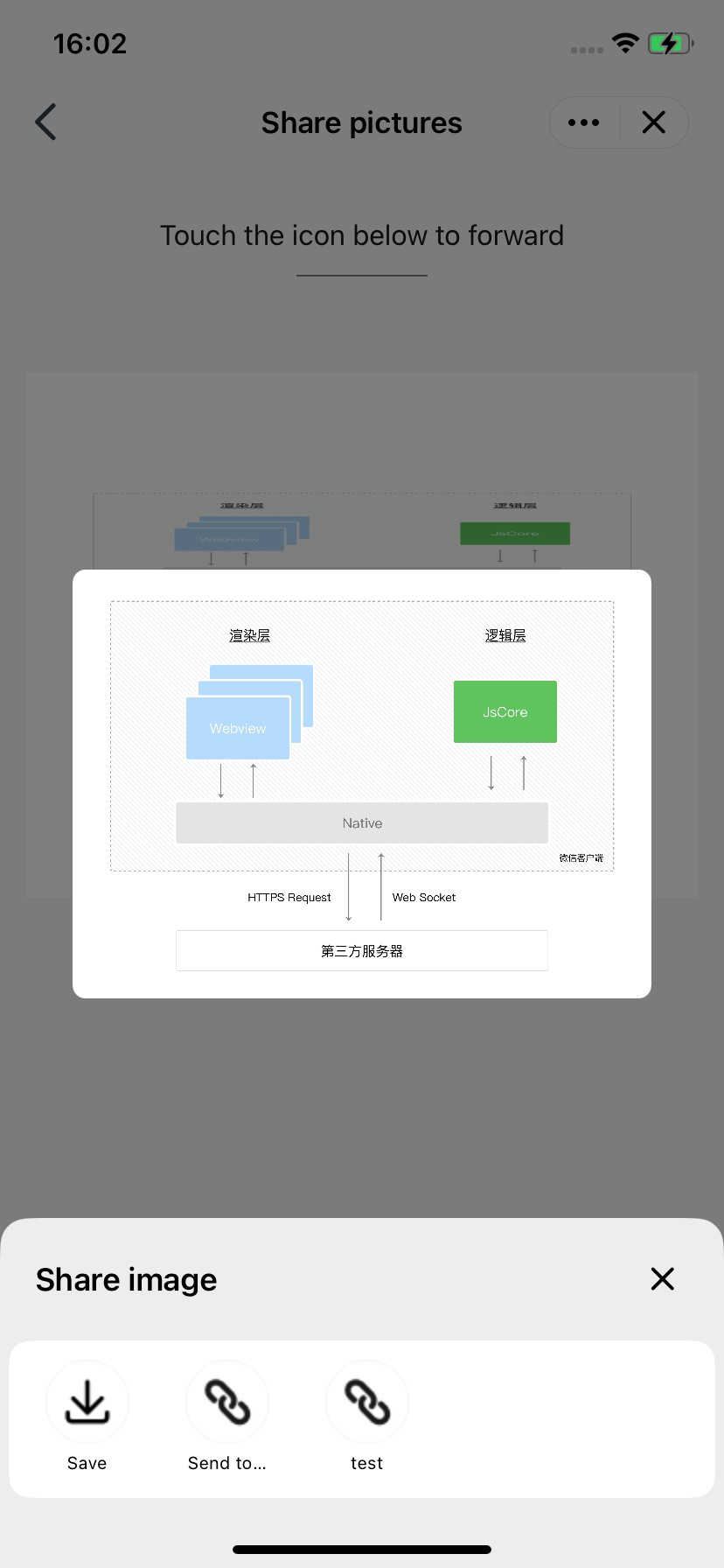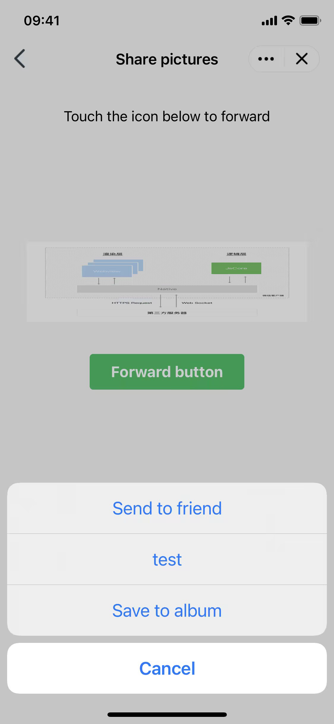 - (NSArray<TMASheetItemInfo *> *)customizedConfigForImageShare {TMASheetItemInfo *item = [[TMASheetItemInfo alloc] initWithTitle:@"Send to friend" type:MAUIDelegateShareViewTypeCustomizedShare shareTarget:200 shareKey:@"my"];TMASheetItemInfo *item2 = [[TMASheetItemInfo alloc] initWithTitle:@"test" type:MAUIDelegateShareViewTypeCustomizedAction shareTarget:201];item2.action = ^(TMASheetActionParams * _Nullable params0) {NSLog(@"");};return @[item,item2];}