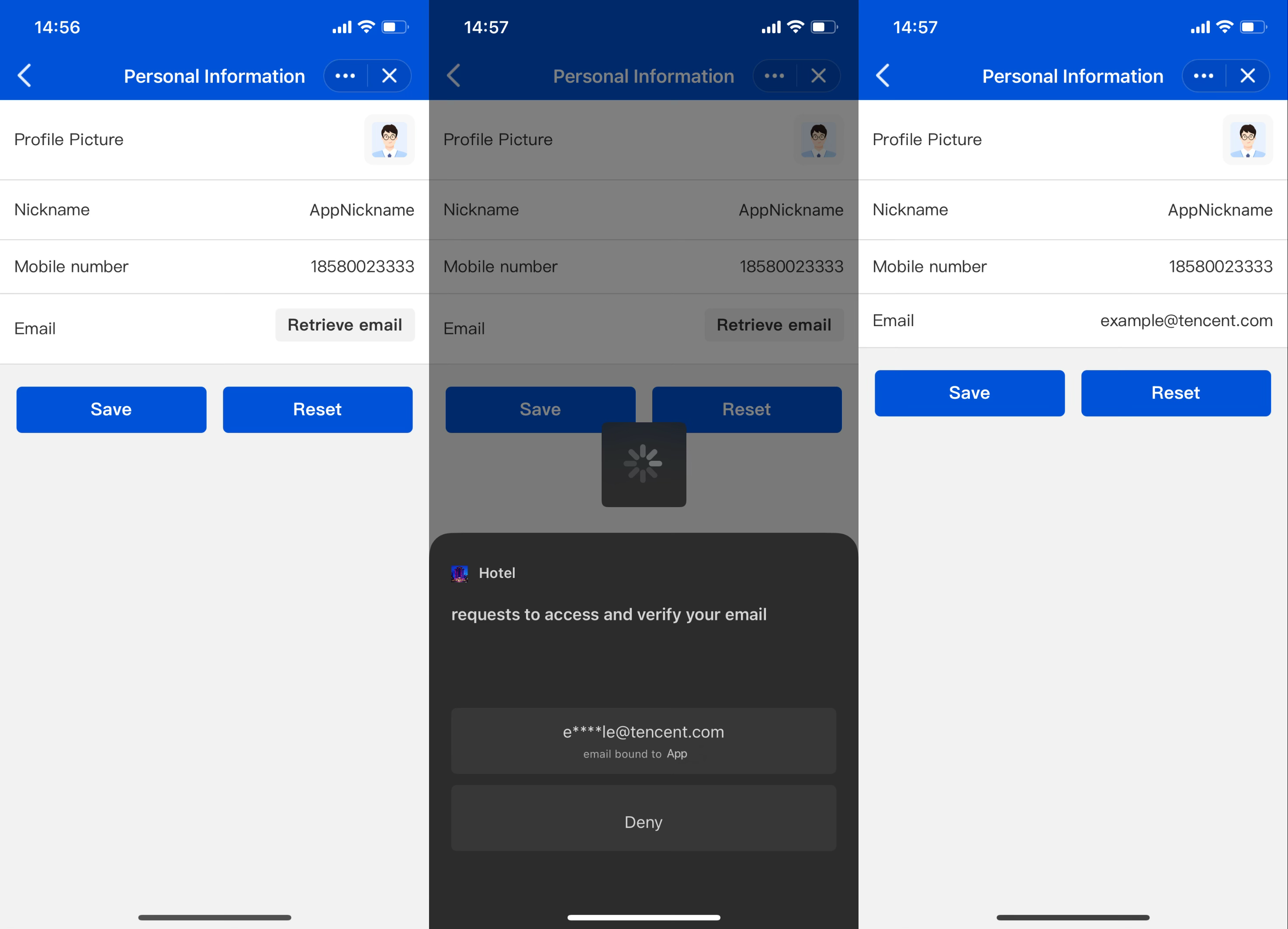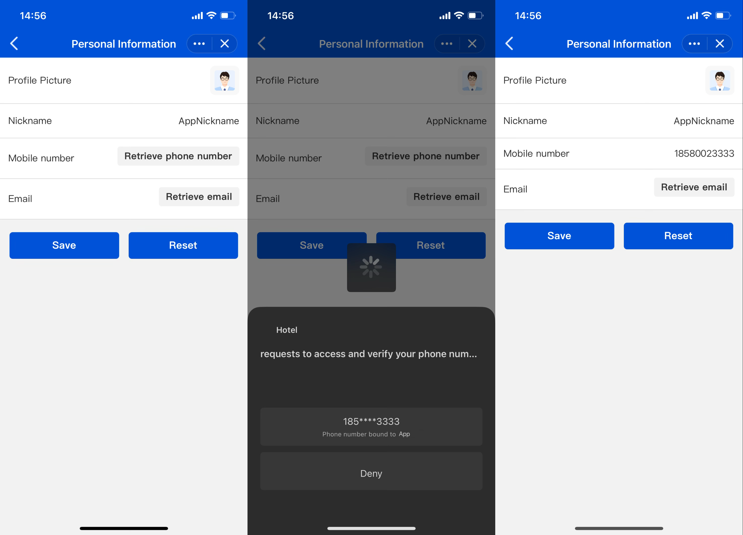 Get the mobile number: Set the value of open-type in the button component to getPhoneNumber. After the user permission is provided, use the bindgetphonenumber event to get the callback information. Pass the dynamic token code from the callback information through a custom API (e.g.,/getUserPhone in the example code) to the mini program backend service, and call the getuserphonenumber API provided by the platform’s OpenServer to obtain the user’s mobile number with the code. Get the email address: Set the value of open-type in the button component to getEmailAddress. After the user permission is provided, use the bindgetemailaddress event to get the callback information. Pass the dynamic token code from the callback information through a custom API (e.g.,/getUserEmailDirect in the example code) to the mini program backend service, and call the getemailaddress API provided by the platform’s OpenServer to obtain the user’s email with the code. Note: