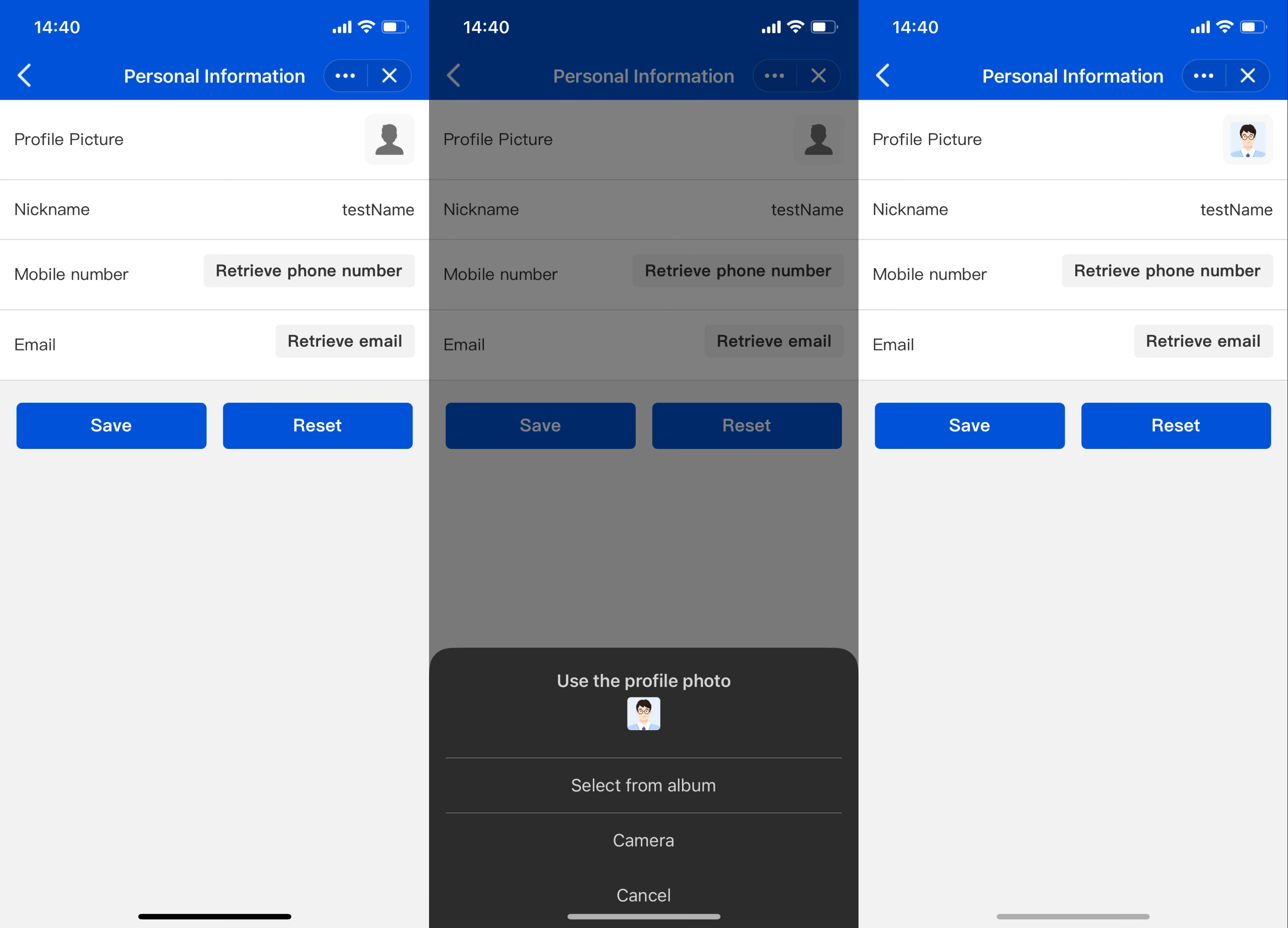 Select a profile photo: Set the value of open-type in the button component to chooseAvatar. After the user selects the desired profile photo, the temporary path of profile photo information can be obtained through the callback of the bindchooseavatar event. Enter the nickname: Set the value of type in the input component to nickname. When users type in the input field, the host app's nickname will appear above the keyboard. By tapping the nickname, it will automatically fill the input field. The latest value can be obtained through the bindchange event bindchange event of the input. Note: