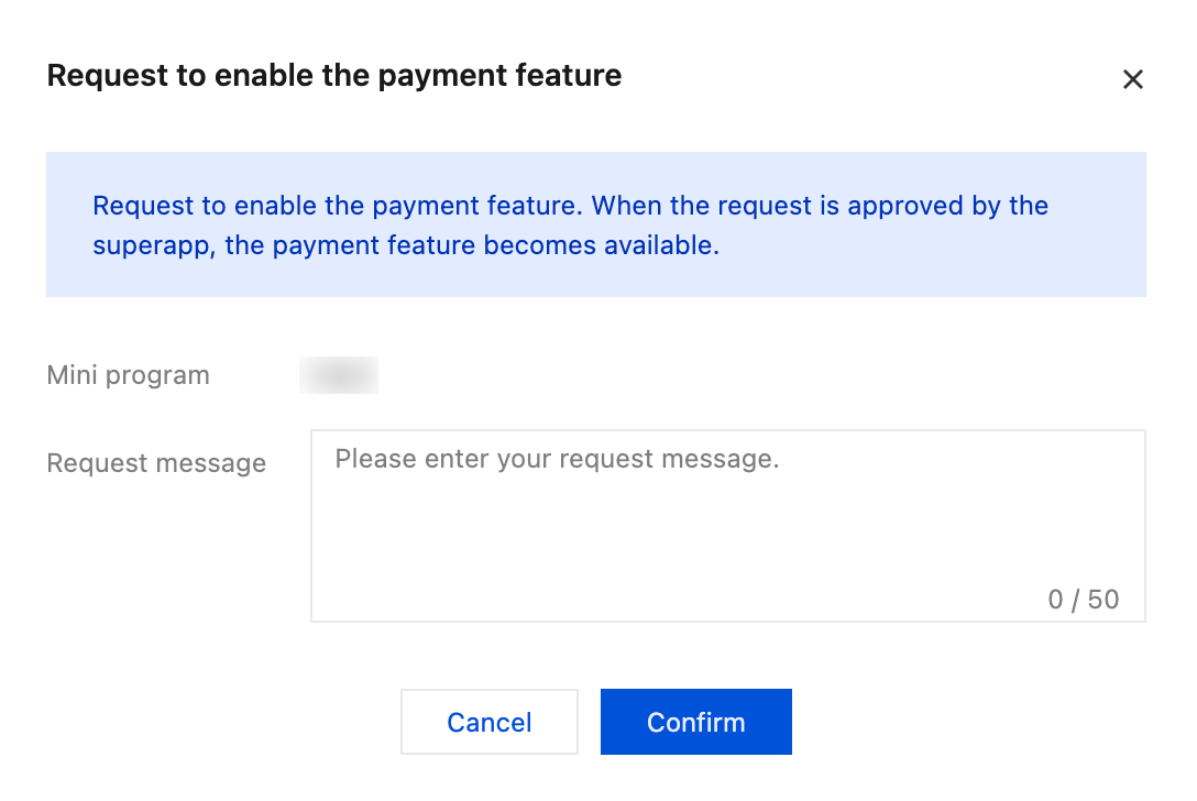 2. Fill in the request message, click Confirm, submit the application, and wait for the superapp approval.