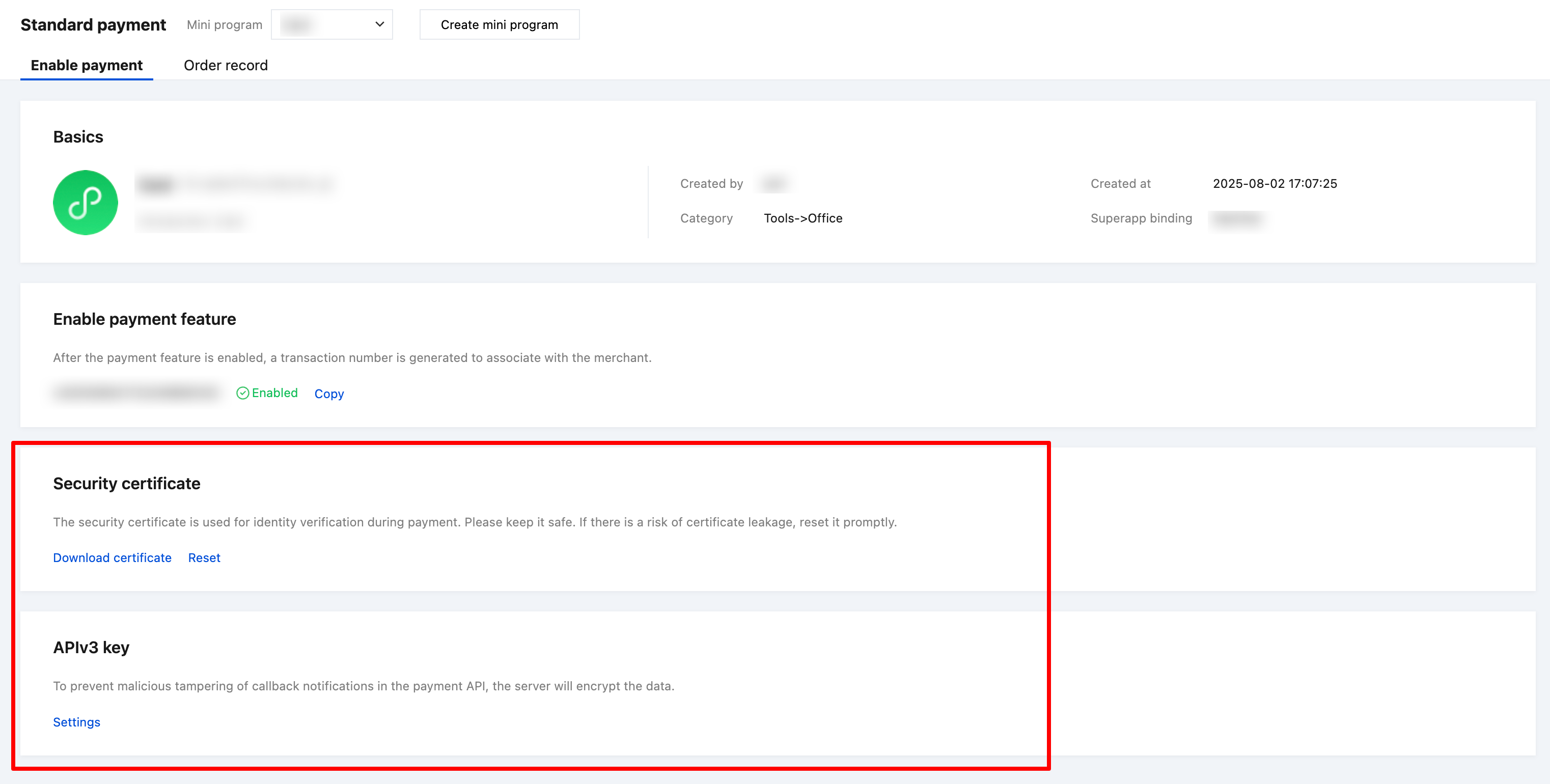 It includes a security certificate and APIv3 key, which are used for identity authentication during the payment process and payment callback information encryption respectively. Only the mini program team administrators and the mini program senior developers can download, reset certificates, and configure keys.