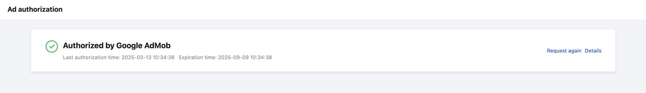 After authorization, you will automatically return to the original page, displaying the status "Authorized by Google AdMob."
