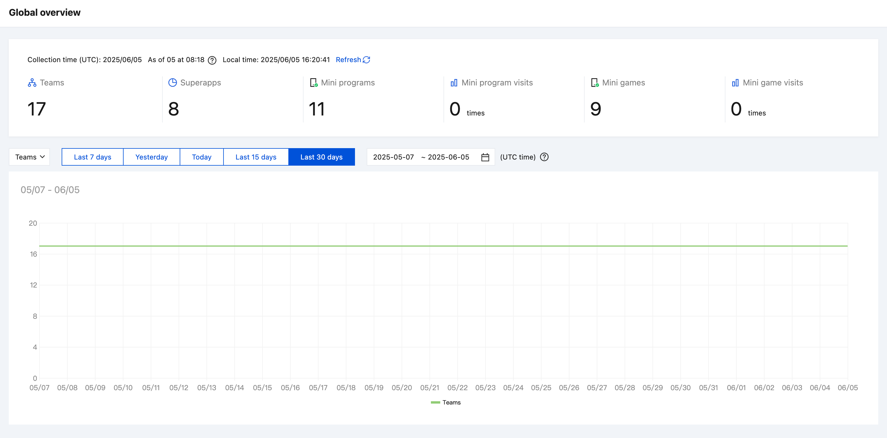 This module enables super admins or platform admins to view the overall data for Super App as a Service (SAS) teams, superapps, mini programs, and mini games.