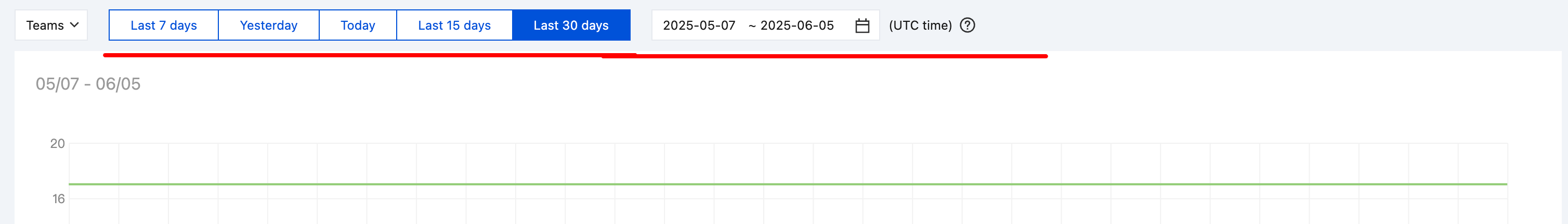 At the top of the line chart, there are quick time options available, allowing you to select "Last 7 days," "Yesterday," "Today," "Last 15 days," or "Last 30 days," or to customize a time range. You can query data for up to 90 days, including the current day.