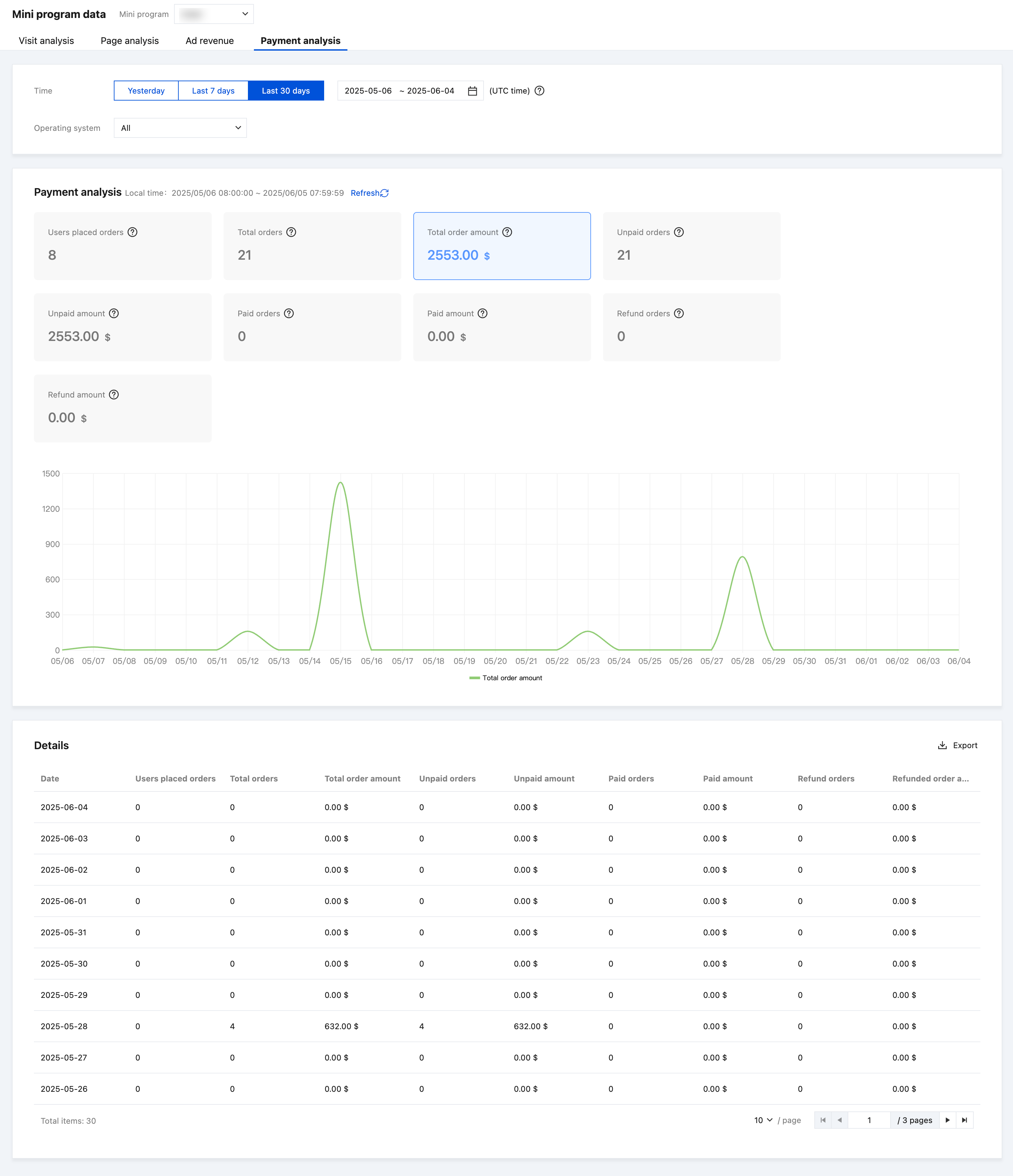 Unpaid amount | Unpaid order amount within the selected period (including canceled and pending payment orders). Unit: Displayed in the currency set by the superapp. |