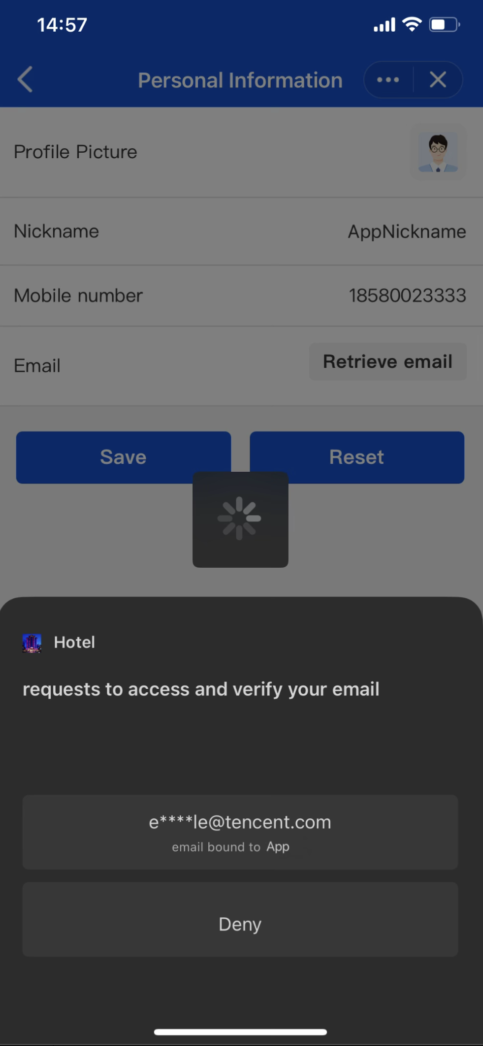 /*** @brief Create a custom phone number acquisition popup** @param frame The window size* @param appInfo The current mini program information* @param maskAccount Masked phone number* @param allowBlock allows callbacks* @param denyBlock deny callback*/- (UIView *)createPhoneNumberAuthViewWithFrame:(CGRect)frameappInfo:(TMFMiniAppInfo *)appInfomaskAccount:(NSString *)maskAccountallowBlock:(void (^)(void))allowBlockdenyBlock:(void (^)(void))denyBlock;/*** @brief Create a custom email acquisition popup** @param frame The window size* @param appInfo The current mini program information* @param maskAccount Masked email* @param allowBlock allows callbacks* @param denyBlock deny callback*/- (UIView *)createEmailAddressAuthViewWithFrame:(CGRect)frameappInfo:(TMFMiniAppInfo *)appInfomaskAccount:(NSString *)maskAccountallowBlock:(void (^)(void))allowBlockdenyBlock:(void (^)(void))denyBlock;