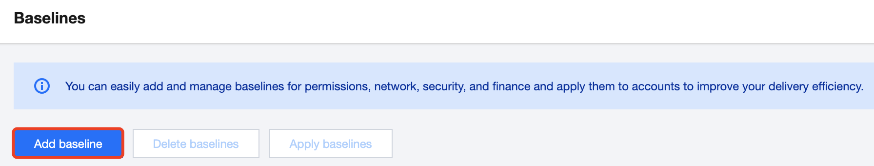 1. Log in to the Tencent Cloud console and go to the Control Center > Baselines page. 2. Click Add baseline.