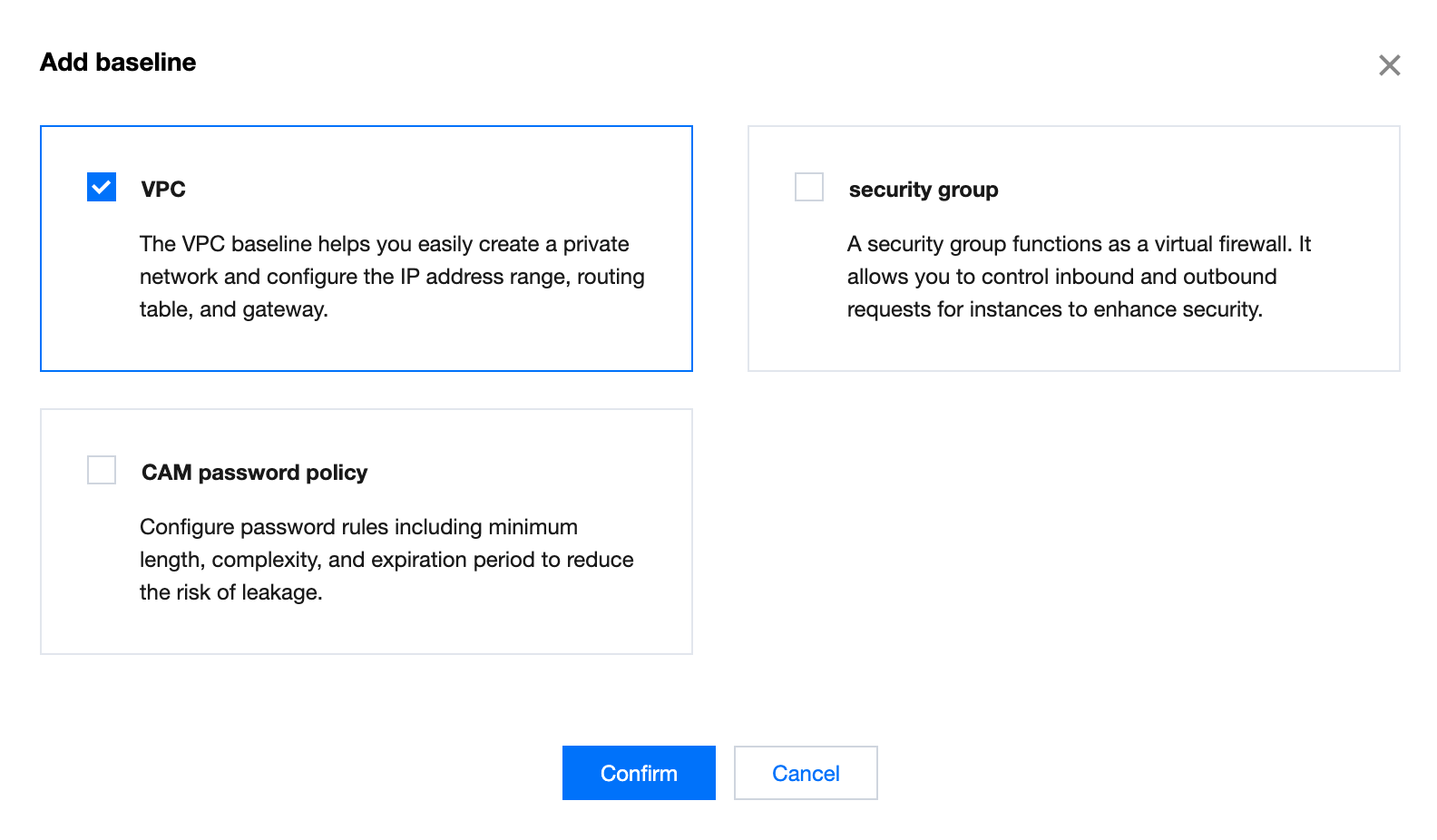 For information about how to configure shared image, see Shared image. For information about how to configure preset tags, see Preset tags. For information about how to configure VPC baseline, see VPC. For information about how to configure security group baseline, see Security Group. Note