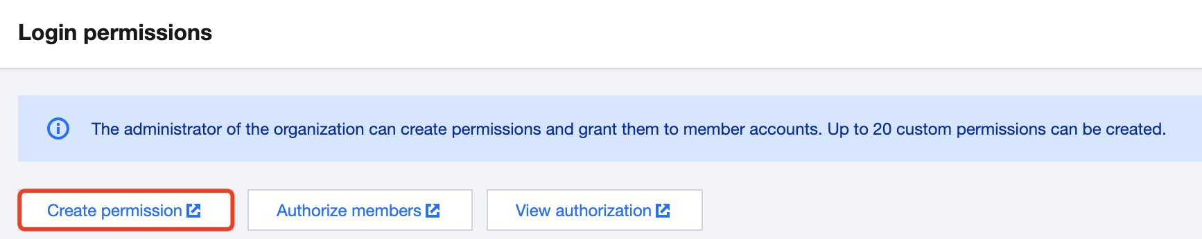 1. Log in to the Tencent Cloud console and go to the Control Center > Login permissions page. 2. To refine permission authorization, click Create permission to go to the Account management > Unified member access page. For more information about how to create a permission, see Creating Member Login Permissions.