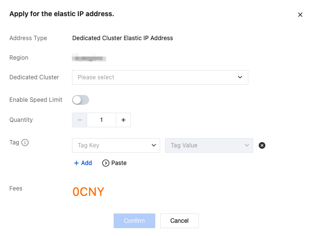 3. In the Request Elastic IP dialog box, complete the following configurations and click OK to complete the request.