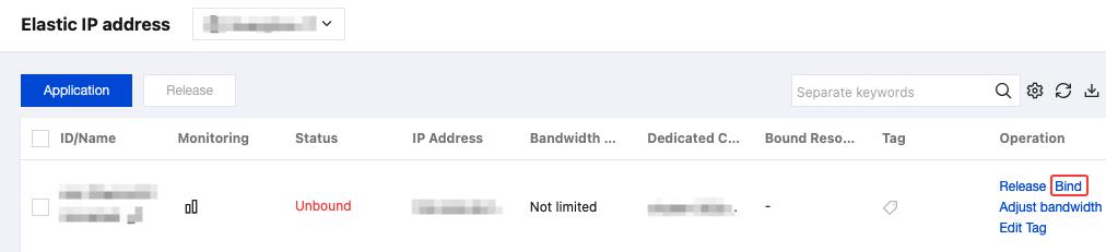 1. In the Elastic IP list, select an Elastic IP with the status unbound, and click Bind.