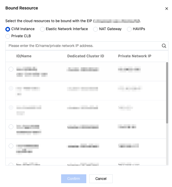 2. In the Bind Resource window that pops up, select the CVM instance to be bound. For the creation process of CVM (Cloud Virtual Machine), see Create and View a CVM. Unbind CVM and Release Elastic IP
