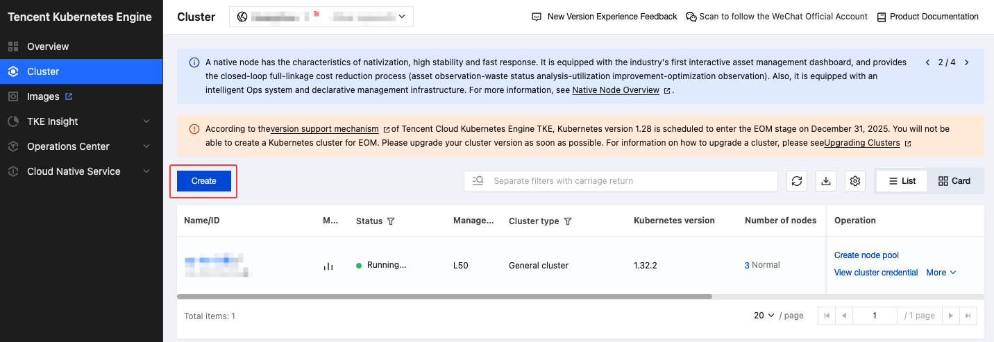 The CDC deployment feature needs to be added to the allowlist. If the relevant configuration does not exist in your console, please contact online customer service for assistance. 3. In the information confirmation step, confirm your configuration information, read and select the TKE Service Level Agreement terms, and clickComplete to complete the deployment of the TKE service in the CDC cluster. 4. The cluster is ready for use after initialization completes. You can click the instance details to view the cluster initialization progress.