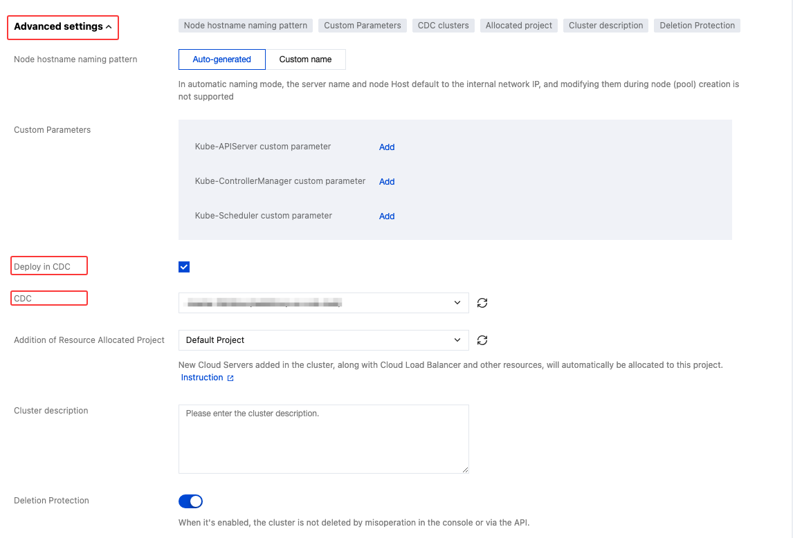 1. Log in to the TKE console, select the target region in the cluster list, and click Create. 2. On the cluster creation page, follow the instructions to complete cluster information configuration, network configuration, and component configuration. Among which, in the cluster information step, click Advanced Settings, select Deploy in CDC, and choose the Tencent Cloud CDC cluster to deploy. Other configurations are consistent with creating a TKE cluster. For details, see Creating a Cluster. Note: