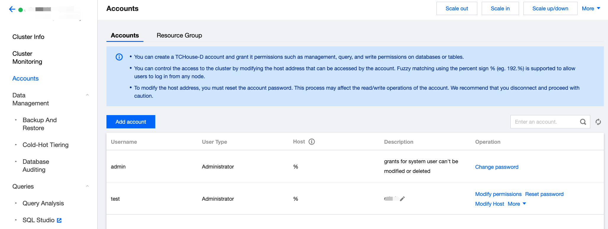 The Tencent Cloud TCHouse-D Console provides a visual interface for convenient and efficient account and privilege management of clusters.