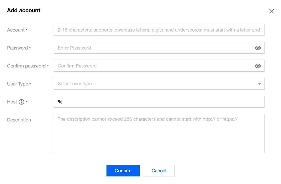 4. Host: Supports individual IP addresses, or use % to imply no restrictions.