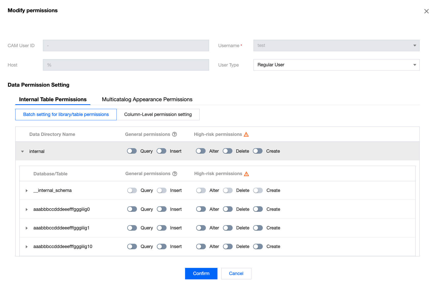 You can choose to set internal level permissions in batch: Once the internal level permissions are authorized, the user will have access to all databases and tables under internal.