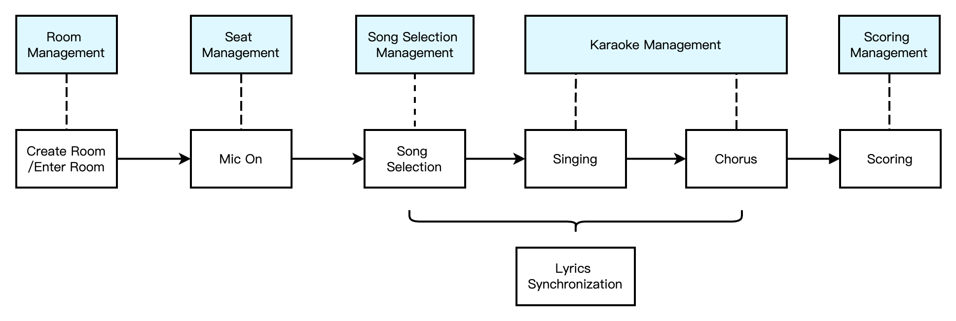 The Karaoke system primarily includes functions such as: Karaoke play mode, start/stop/switch songs, accompaniment and vocal volume adjustment, reverb/sound effects, original sound and accompaniment switch, and lyrics synchronization. Below, we will introduce the implementation process of the Karaoke management module in detail through two typical Karaoke gameplay: solo singing and real-time chorus.