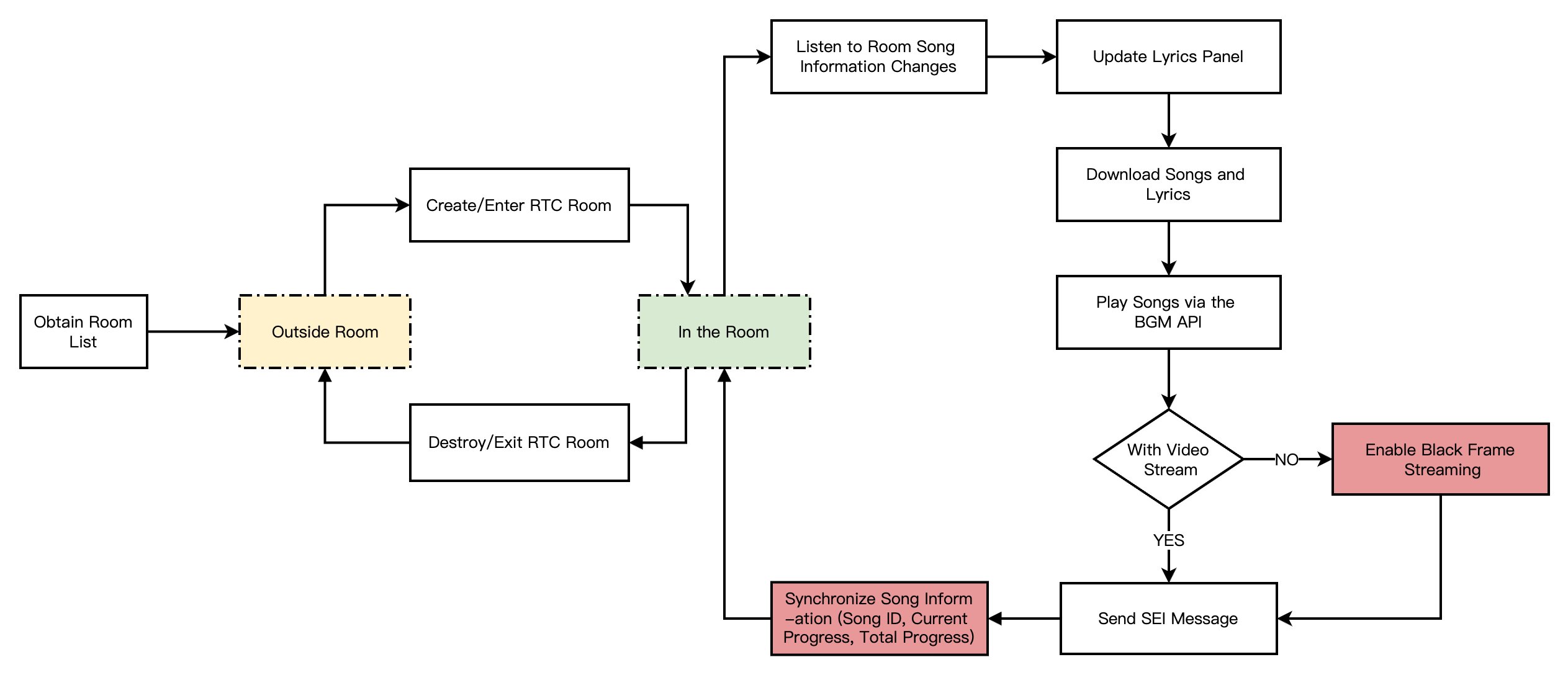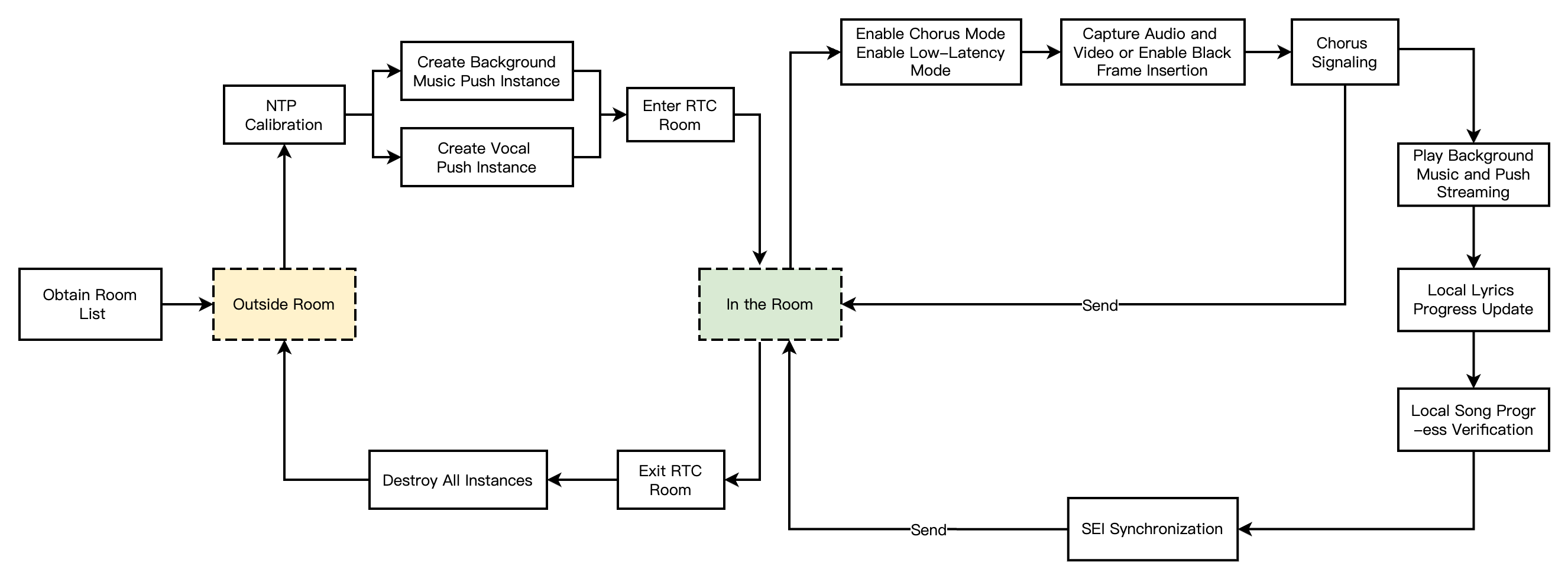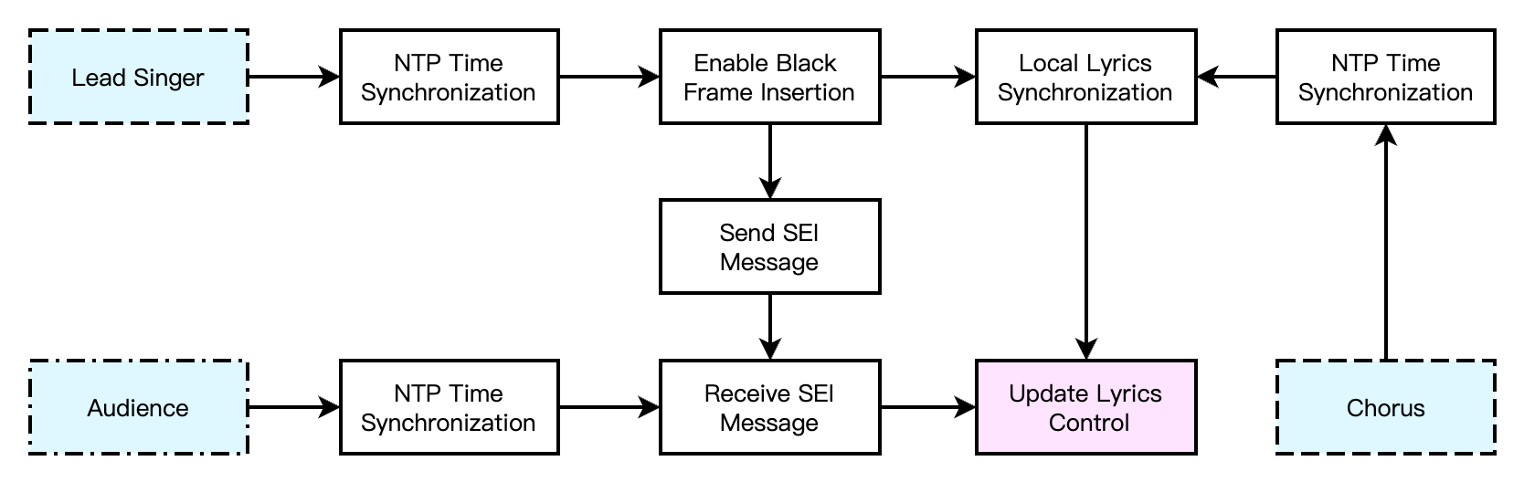 Depending on business needs, you can choose a real-time chorus solution for audio-only or audio and video scenarios. If it is a pure audio scenario, black frames need to be added to send SEI messages for lyric synchronization.