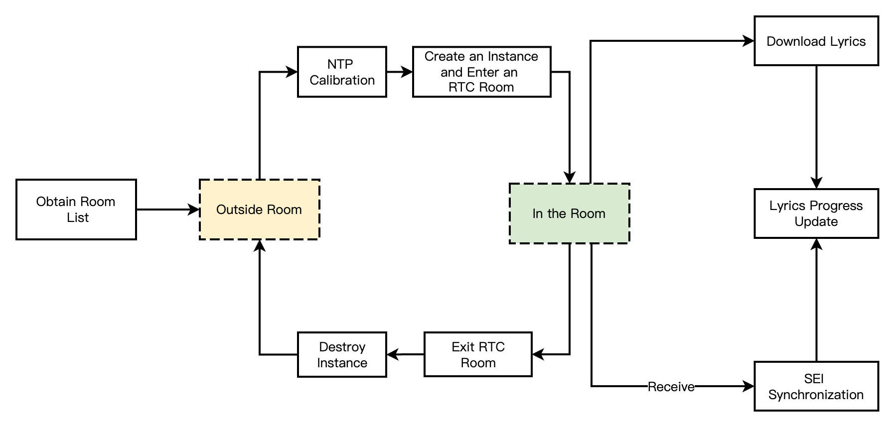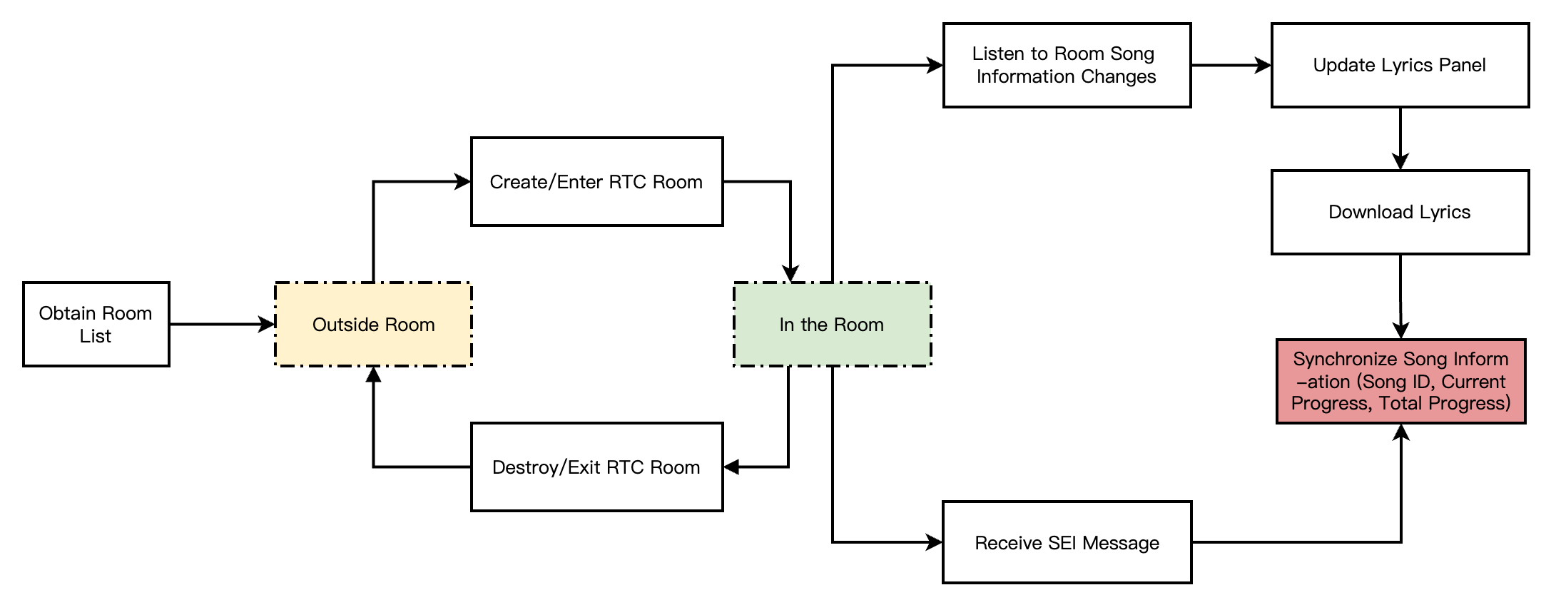 Among them, the lead singer and chorus update the lyric progress locally based on the playback progress of the synchronized accompaniment; the audience needs to receive SEI messages sent from the lead vocalist containing the latest lyric progress to update the local lyric progress. The overall process of the lyrics synchronization solution is shown in the following diagram.